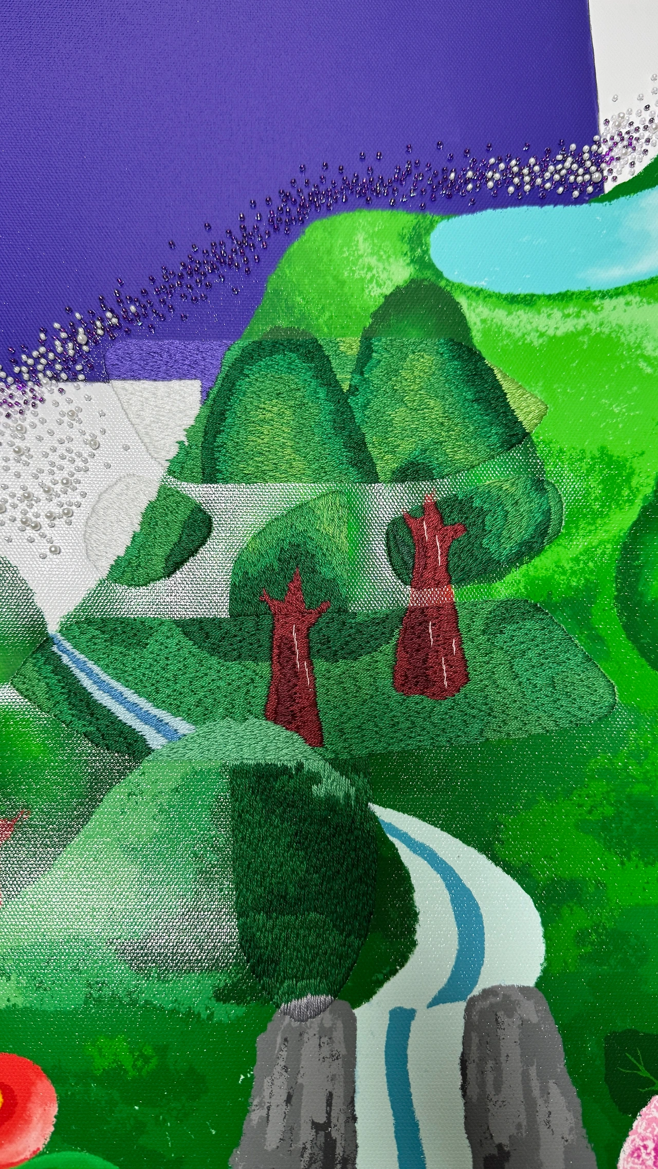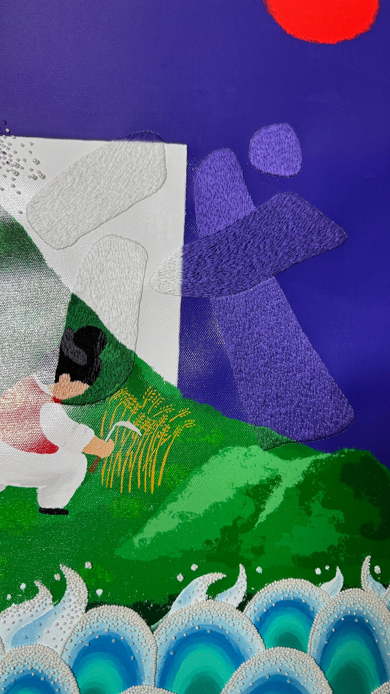 자수를 놓을 때는 한자의 획이 나아가는 방향과 실의 결을 하나로 맞추었다. 붓의 흐름을 바늘로 정직하게 따라가는 시간이었다. 요란하게 빛나지 않아도 제자리에서 조용히 세상을 지탱하는 마음들, 그 마음들이 모여 온전한 태평성대를 이루기를 바라며 한 땀 한 땀 결을 채웠다.