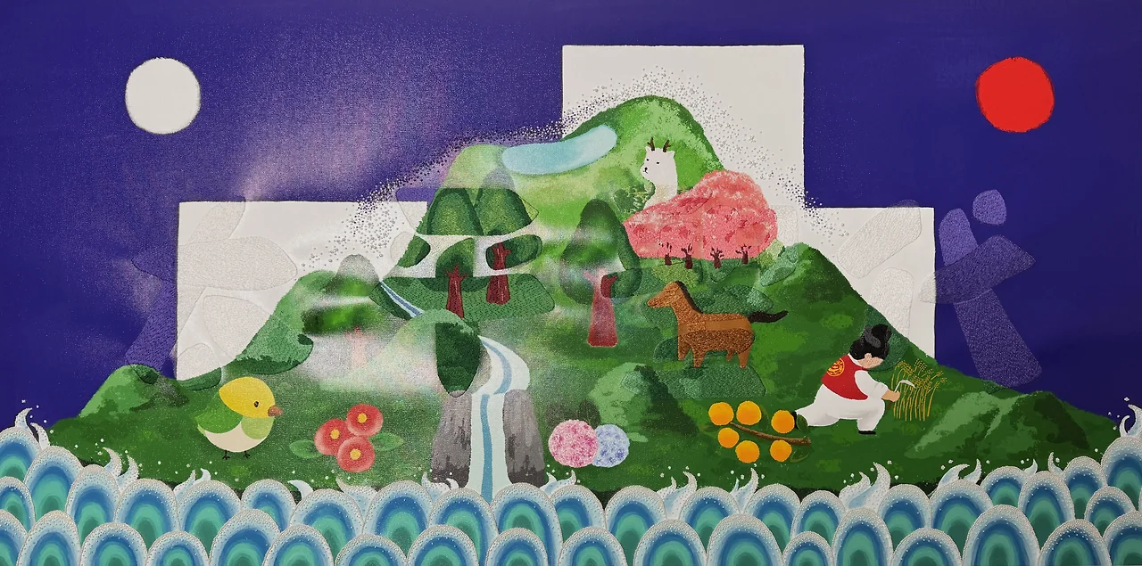 조선시대 왕의 등 뒤를 묵묵히 지키던 일월오봉도의 틀을 빌려왔다. 왕의 권위를 상징하던 그림은, 이제 내가 발 딛고 사는 제주 도민들의 평온한 삶을 기원하는 풍경으로 자리를 바꾼다.