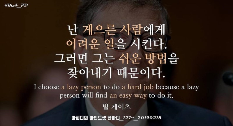 또한, 인터넷에서 돌던 빌 게이츠가 게으른 사람에게 어려운 일을 시키면 쉬운 방법을 찾아낸다는 내용의 밈이 돌았었습니다.