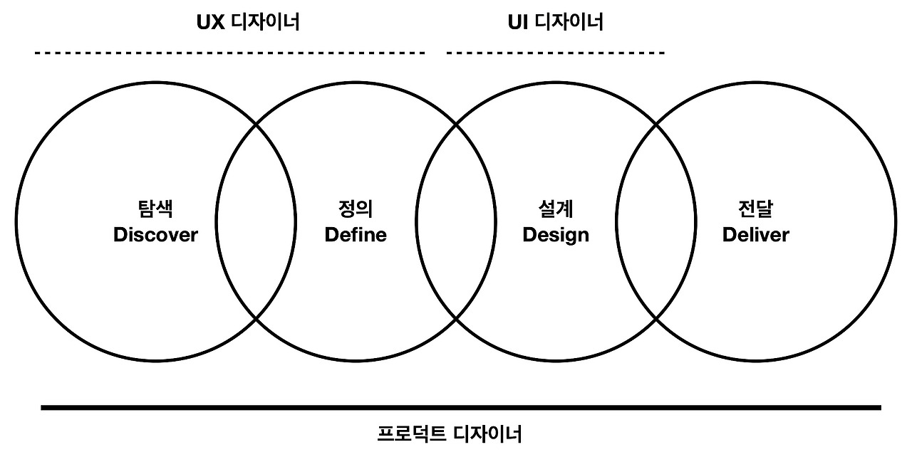 박종민(2021)은 더블 다이아몬드 프로세스의 탐색, 정의, 설계, 전달 단계에서 프로덕트 디자인은 모든 단계를 포괄적으로 담당하는 업무라고 했습니다. 이를 정리하면, 프로덕트 디자인은 가설을 세우기 위한 탐색, 기획, 문제 정의와 문제 개선을 위한 디자인, 검증 후 전달까지 모두 담당하는 역할이라고 할 수 있습니다.
