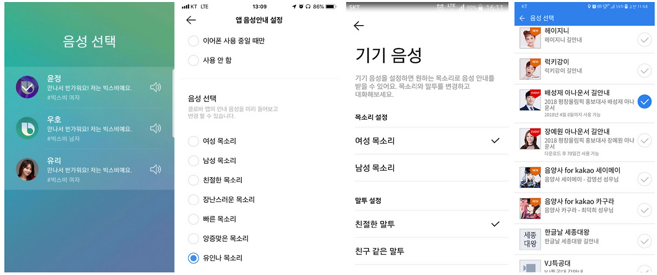 네이버에서는 연예인 유인나의 목소리를 AI 어시스턴트의 목소리로 설정할 수 있는 기능을 제공했습니다. 또한, 내비게이션에서 들을 수 있는 목소리에는 만화 캐릭터까지 포함되어 있습니다. 이처럼 다양한 목소리가 활용되고 있음을 알 수 있습니다.