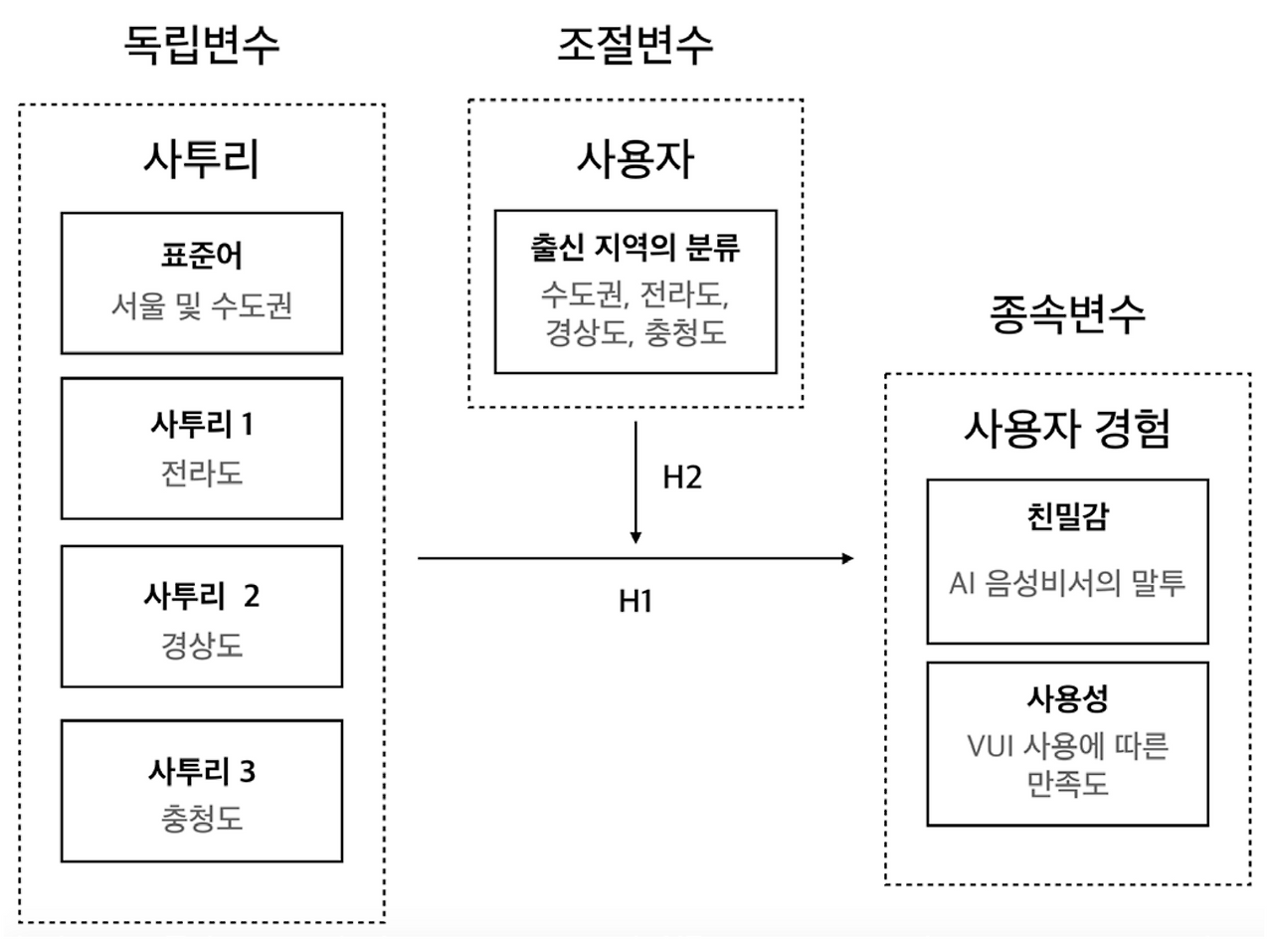 이런 상상을 바탕으로 가설을 하나 세웠습니다. 'AI 어시스턴트가 사투리를 구사한다면, 특정 사용자의 경험에 영향을 미칠 것이다'라고 말이죠. 즉, 긍정적인 심리는 AI 어시스턴트를 친밀하게 느끼게 도와주며 대화 빈도를 늘리지 않을까 생각했습니다.