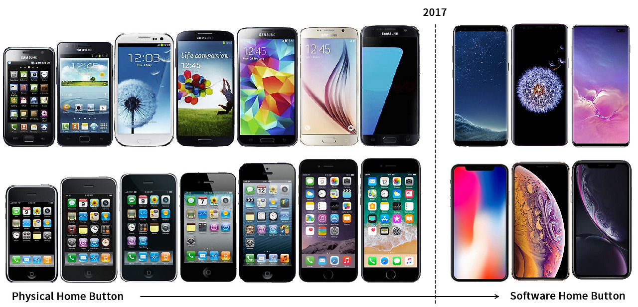 스마트폰의 대표 디자인은 애플의 아이폰과 삼성의 갤럭시일 것입니다. 두 제품은 이미 세계의 점유율을 절반 이상 차지하고 있죠. 이러한 대표 스마트폰의 디자인은 2017년을 기점으로 크게 변화하게 됩니다. 애플과 삼성이 기기 전면에서 물리적 버튼을 배제했기 때문입니다.