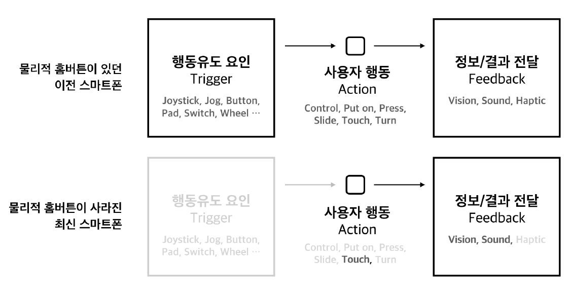 이처럼 문헌 조사를 보면, 사용자와 스마트폰 사이에는 사용자가 디바이스를 조작할 방법을 인지할 '트리거', 트리거를 인지한 대로 '행동', 디바이스를 조작하고 결과를 보고 느끼는 '피드백'으로 구성할 수 있습니다.