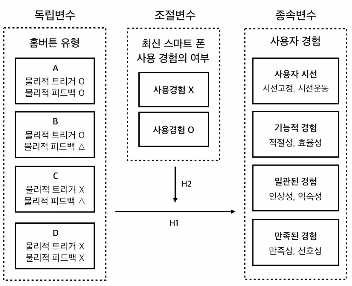 이렇게 구성된 4가지의 유형이 사용자 경험(사용성, 사용자 심리)에 미치는 영향을 확인하고자 했습니다. 그리고, 소프트웨어 홈버튼을 사용한 경험의 유무를 별도로 구분하여, 경험 유무가 미치는 영향을 확인하고자 했습니다.