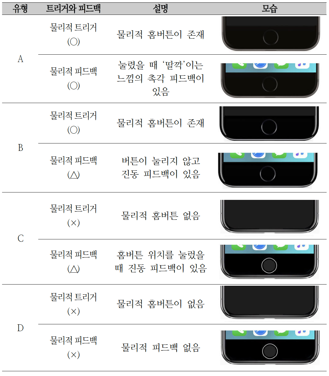 탐구를 위해서, 홈버튼 유형을 물리적 형태로 인해 사용자에게 눌러야 한다는 인지를 주는 '트리거'와 홈버튼을 누른 다음 느낄 수 있는 촉감의 '피드백'을 바탕으로 유형을 구분했습니다.
