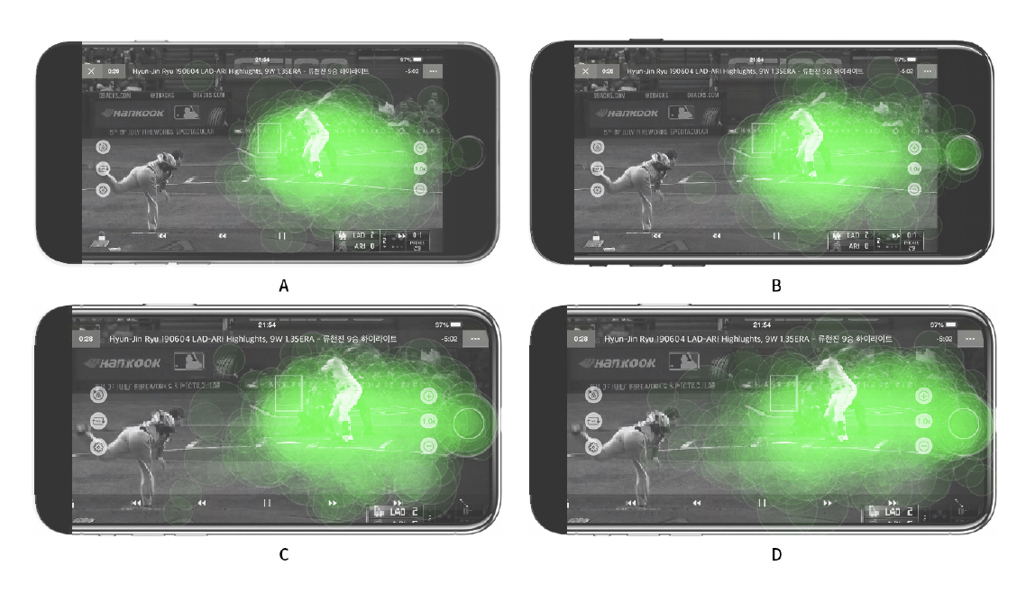 탐구를 하기 위해, 스마트폰에서 MLB 하이라이트 영상을 감상하게 했습니다. 이유는, 타자가 화면 한가운데 네모 영역에 공을 던지기 때문에, 시선을 화면 중앙부에 집중하게 할 것이라 판단했기 때문입니다. 영상을 보는 중, 사용자가 홈으로 복귀하도록 요청하면 어떻게 될까요?