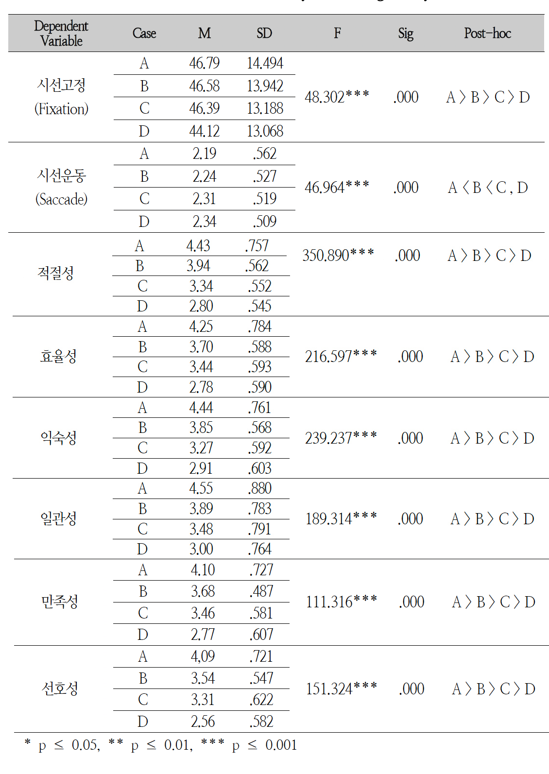 그리고 아이트래킹을 통해서 수집한 눈동자의 고정시간과 움직인 운동값, 사용자가 5점으로 평가한 사용자 경험의 사용성과 심리의 값을 통계로 검증하였습니다. 검증 결과, 옛 아이폰의 홈버튼 형태가 모든 부분에서 긍정적인 평가를 받았습니다. 그리고 모든 홈버튼 유형의 차이는 유의미한 차이가 있다고 확인했습니다.