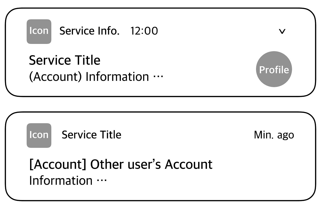 현재 스마트폰은 애플리케이션에 접속된 모든 계정의 정보와 이벤트를 팝업으로 전달합니다. 스마트폰의 대표 OS인 안드로이드와 iOS는 애플리케이션 종류, 이벤트에 대한 내용과 발생 시간, 이해 관계자의 계정을 팝업은 다음과 같은 형태로 구성되었습니다.