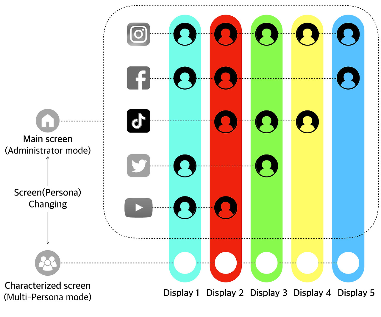 컴퓨터의 계정 분류와 가상 디스플레이의 구조는 하나의 애플리케이션에 여러 계정을 등록하고, 상황에 따라 계정을 이동하는 멀티 페르소나의 상황과 유사하다고 할 수 있습니다. 이는 한 대의 컴퓨터에 계정, 가상 디스플레이로 사용자 환경을 구분하고 넘나들도록 한 구조가 다소 유사하기 때문입니다.
