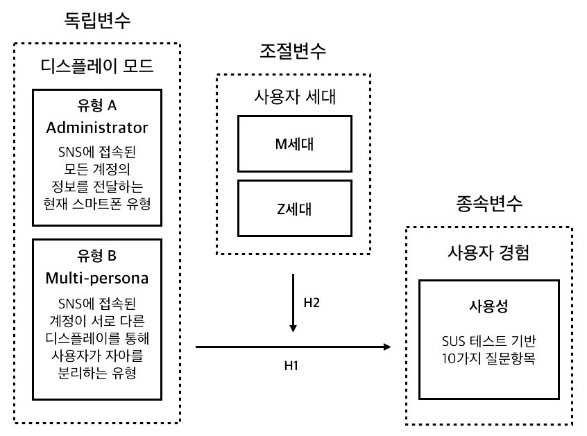 마지막으로, MZ 세대를 분류하여 피험자를 구성했습니다. 이는 책에서 라이프스타일에 따라 여러 계정을 분류하여 활용하는 사용자를 20~30대로 제시한 점과, 상기의 멀티 페르소나를 1997년 전후 태생인 Z세대의 트렌드로 제시한 부분에 차이가 있기 때문입니다. 이를 위해서 만든 실험 모형은 다음과 같습니다.