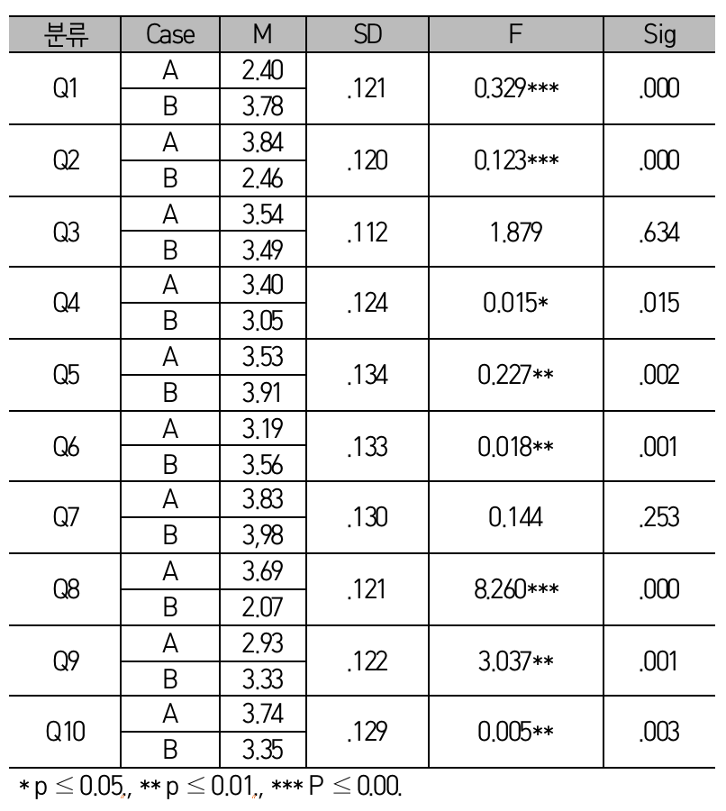 실험 결과, 콘셉트로 만든 B 유형은 재사용, 일관성, 자신감과 같은 심리적 측면의 문항에서 긍정적이었습니다. 반대로, A 유형은 쉽고 편리한 사용 방법에 대한 문항에서 평균적으로 높은 결과를 도출했습니다. 위 차이는 유의변수 0.05보다 낮음으로써 차이가 유의미했음을 확인했습니다.