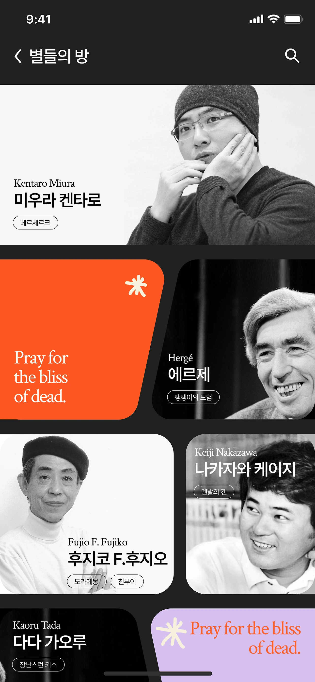 만화에서도 쉽게 찾아볼 수 있다. 산악 중 실족사로 인해 미완된 짱구는 못 말려, 작가의 사망으로 주인공의 성장 과정을 모두 다루지 못한 도라에몽, 급성 대동맥박리로 20년 간 연재하고 미완이 된 베르세르크.