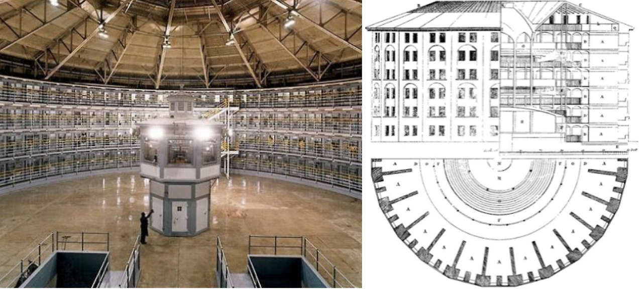 파놉티콘(Panopticon)은 공리주의 철학자 제러미 벤담이 고안한 교도소의 형태이다. 일종의 건축 양식이며 그리스어로 ‘모두’를 뜻하는 ‘pan’과 ‘본다’를 뜻하는 ‘opticon’이 합성된 용어로 ‘모두를 본다 ‘는 뜻이다. 파놉티콘 설계는 중앙에 감시자가 있는 곳을 중심으로 모든 감옥 방이 원형으로 배치된다. 이로써 감시자는 한눈에 모든 수형자의 행동을 파악할 수 없어 감시를 받고 있는 것으로 추정하게 된다. 이로 인해 수형자들은 저항을 최소화하고 규칙을 내면화하여 스스로를 규율하게 된다.