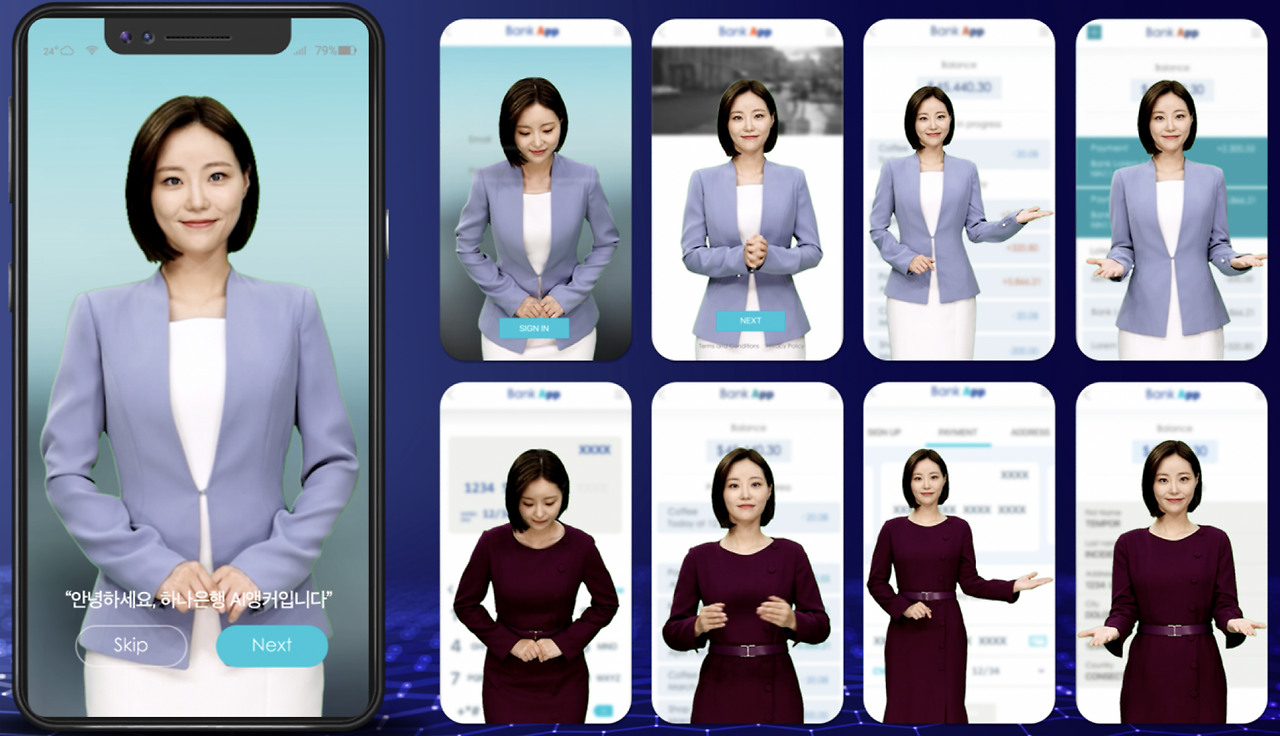 하나 은행에서는 금융권 모바일 앱에서 최초로 AI 휴먼을 활용하였다. 모바일 스마트 뱅킹 앱 ’ 하나 1Q‘에서 허송연 아나운서를 모델로 AI 휴먼을 제작하였다. 상황에 맞게 응대가 가능하도록 두 가지의 유형의 의상과 제스처들을 결합하여 금융권에 상황에 맞춰 대응할 수 있게 구성하였다.