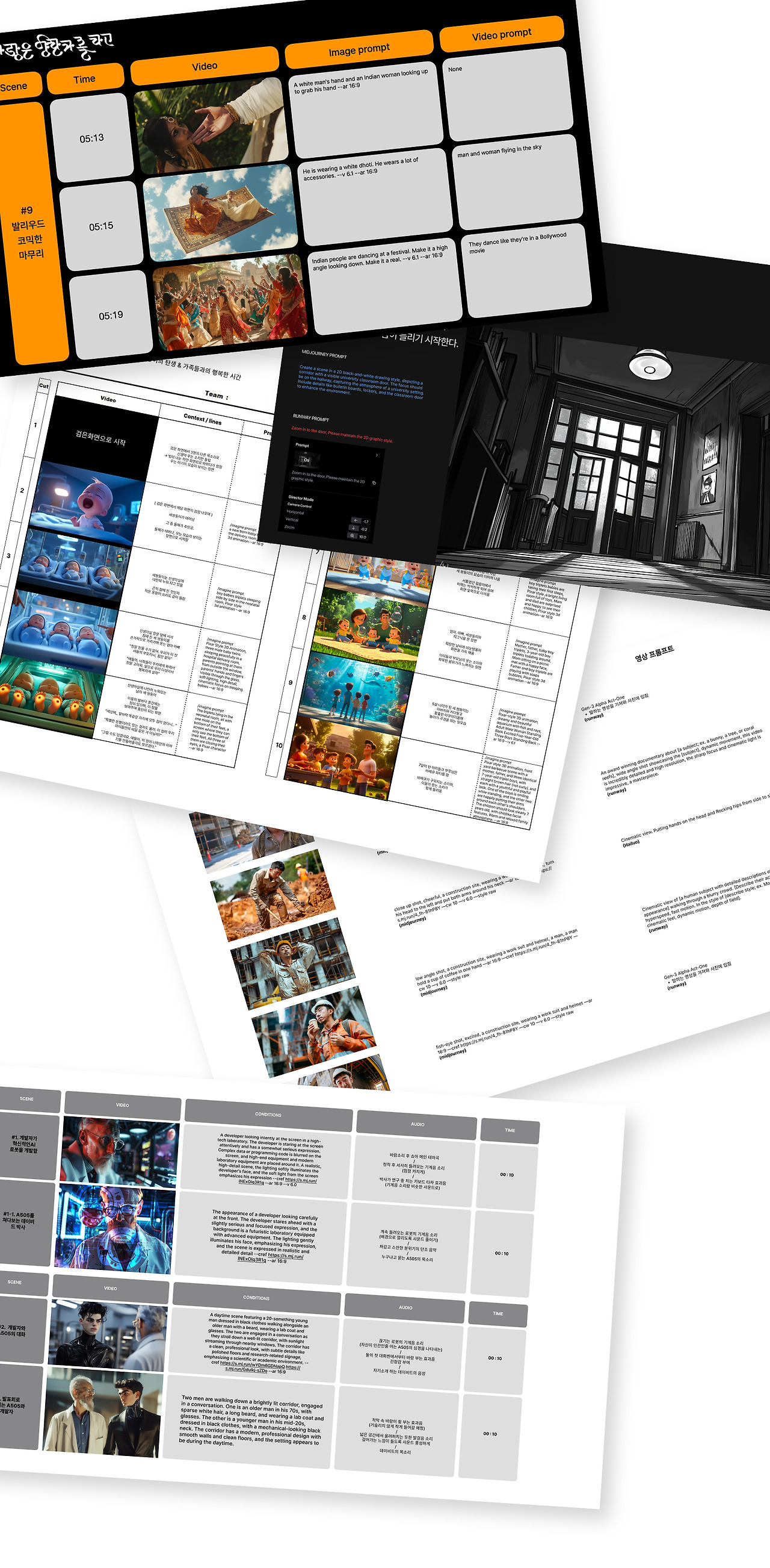 마지막으로 이미지와 영상을 만드는데 도움이 될 수 있도록, 중간고사에 준비한 스토리보드에 상세한 시나리오 장면 설명을 이미지와 영상 프롬프트로 교체하여 문서로 구성했다. 이를 통해 모든 학생들이 다른 팀에서 생성한 실사풍 영상, 애니메이션, 게임 느낌의 영상 등의 구현 방법을 이후에 참조할 수 있도록 했다.