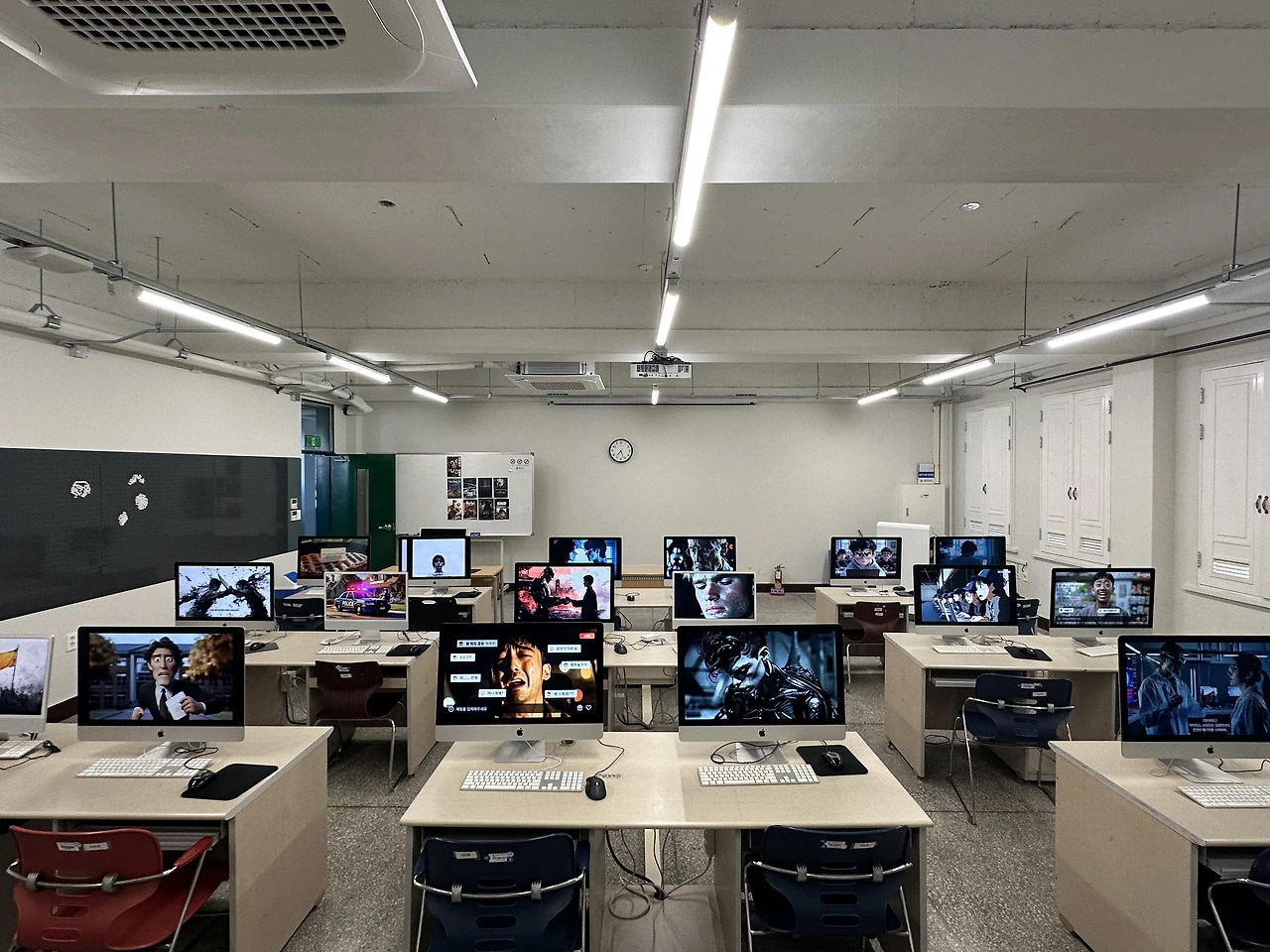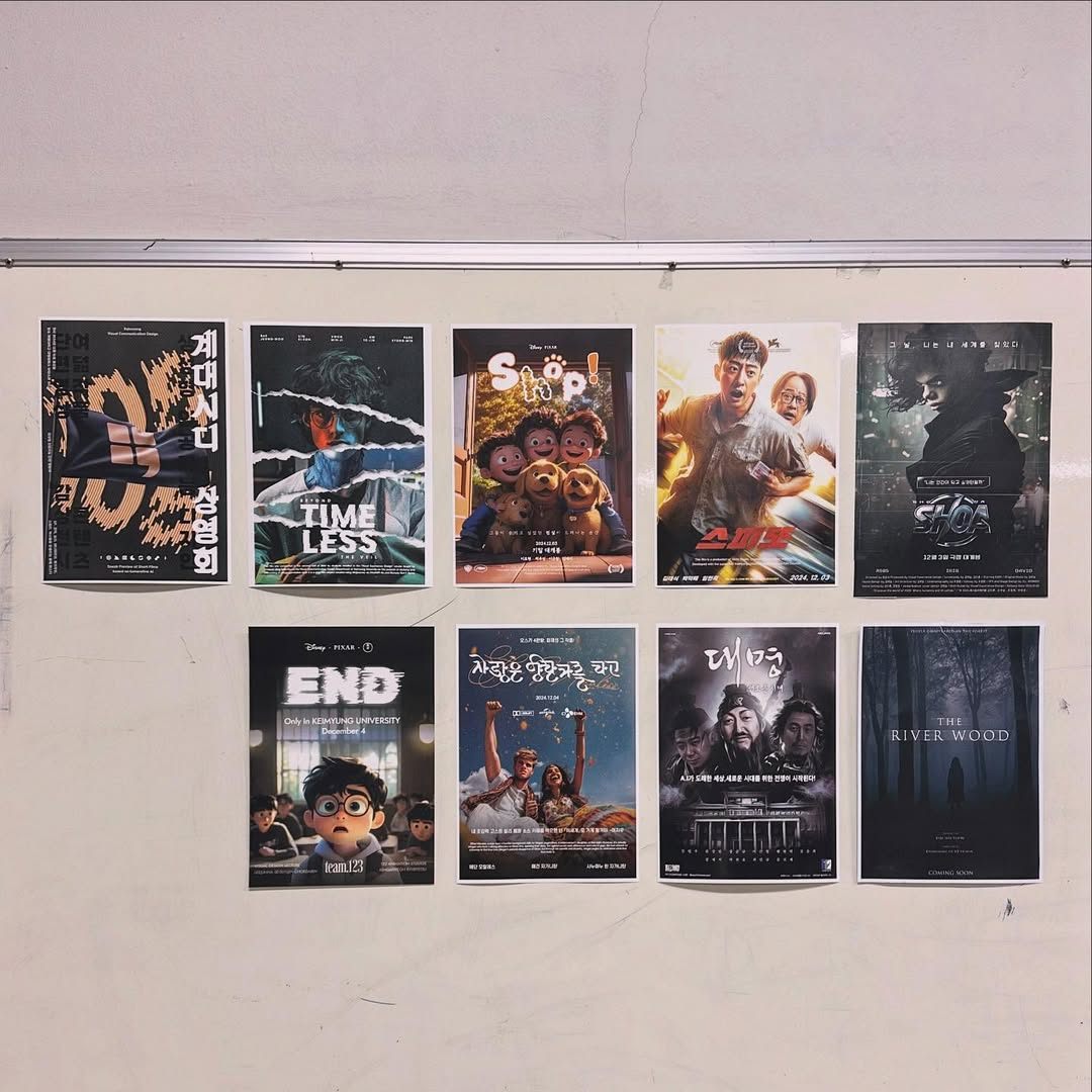 영화 포스터는 미드저니로 생성한 이미지를 직접 포토샵과 일러스트레이터, 피그마와 블랜더를 통해서 구성했다. 이렇게 준비한 기말고사 발표 현장의 상영회 포스터와 종강 후 컴퓨터실에서 영상을 루핑 시킨 과제전은 다음과 같다.