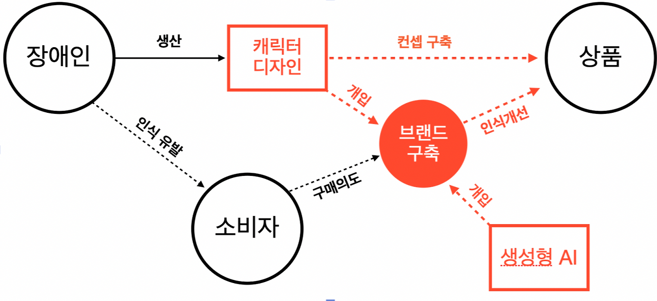 생성형 AI가 전문가처럼 디자인 결과물을 빠른 시간 내 생성하는 점을 바탕으로, 장애인의 상품으로써 캐릭터를 구축하고자 했다. 이 과정에서 장애인의 상품이라는 부정적 인식을 개선하는 데 있어, 생성형 AI가 개입될 경우 어떠한 영향을 미칠지 궁금하였다. 이를 확인하기 위해서 소비자에게 장애인이란 인식을 부정적으로 만들지 않기 위해서 브랜드 구축의 전략이 필요한데, 이 브랜드 구축에 생성형 AI를 개입하고자 했다.