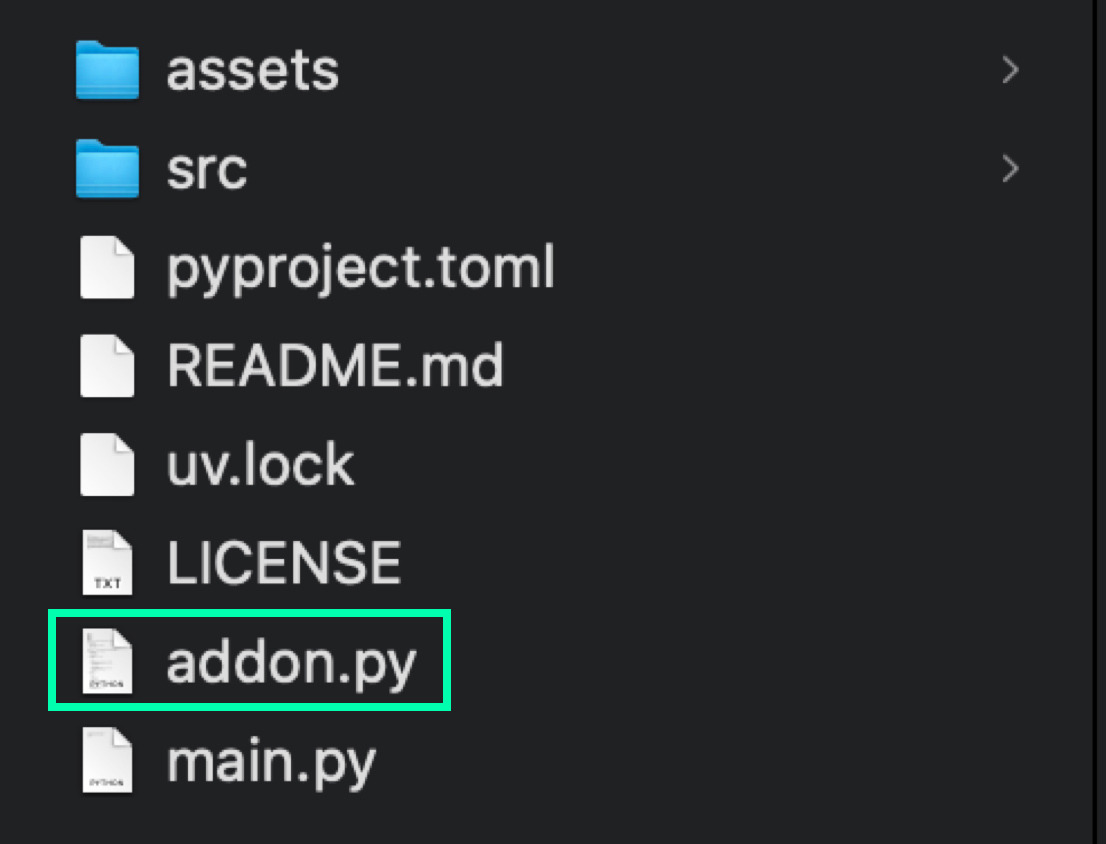 그리고 파일의 압축을 풀어두고 준비하자. (이 과정에서 다운로드 폴더나 바탕화면에 압축을 풀어두는 편이 편할 것이다.) 파일을 압축하고 나서 중요한 파일은 'addon.py' 파일이다. 이 파일만 확실히 기억하고 있자.