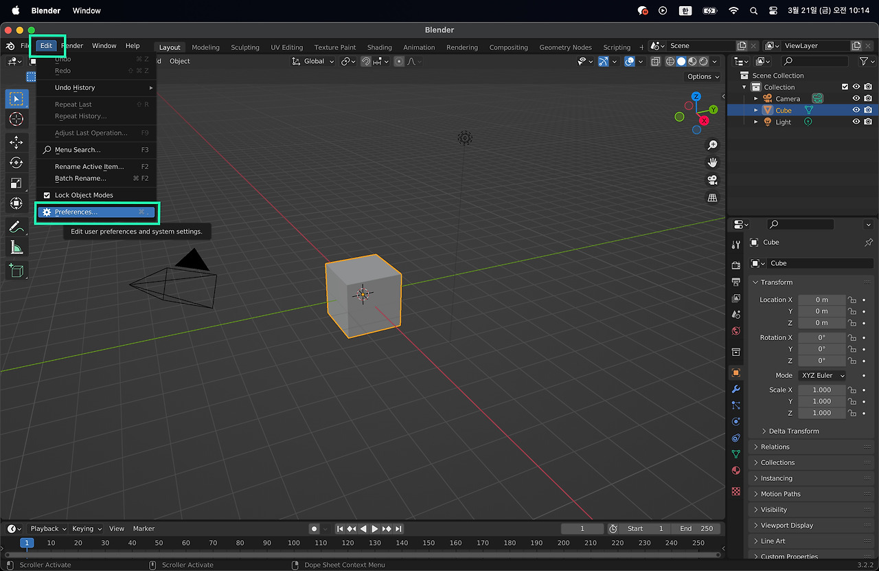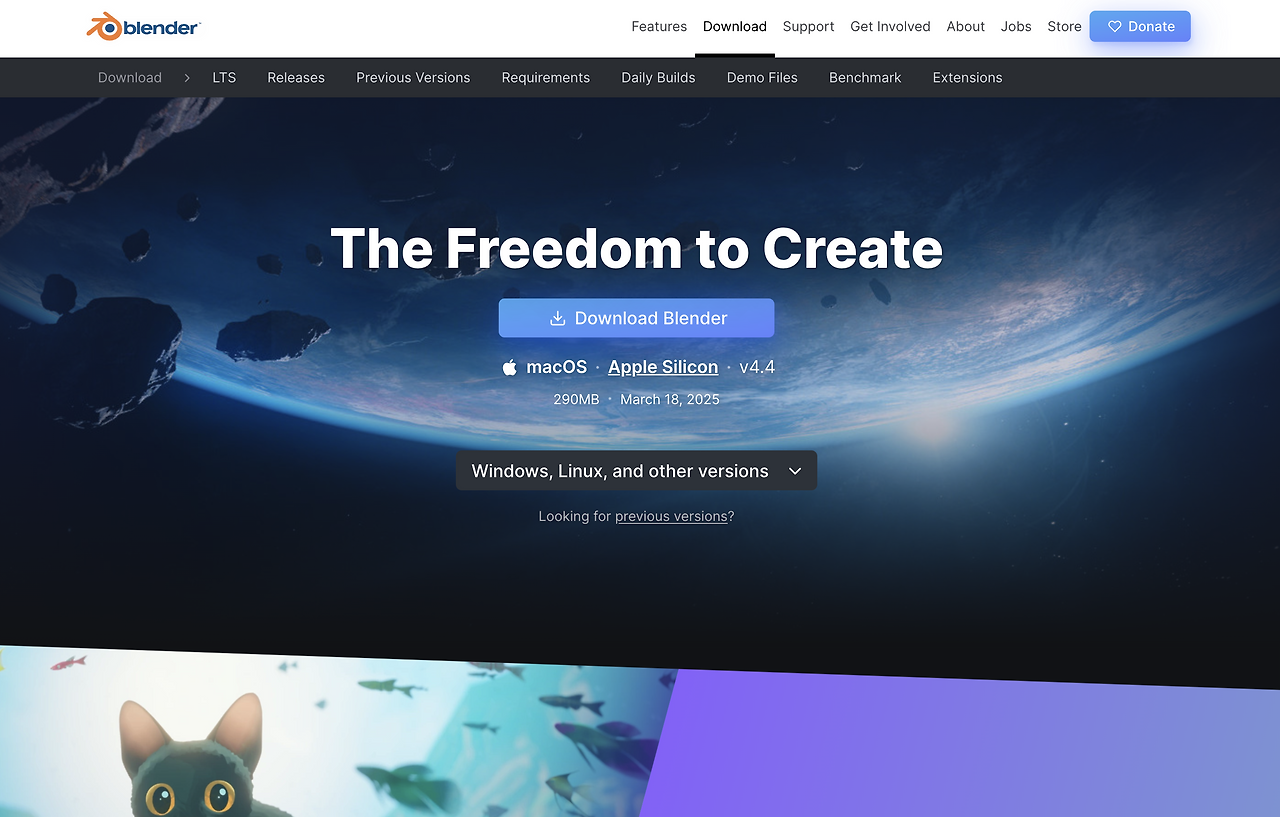 우선 블랜더를 설치하자. 최신 버전을 다운로드하여 설치하면 문제가 없다. 하지만, 이미 설치한 사람이라면 블랜더를 열고 첫 화면에서 상단 우측의 버전을 확인하자. 버전은 3.0 이상이면 된다. 블랜더를 설치하지 않았다면, https://www.blender.org/ 사이트 접속 - 상단 탭 'download'을 들어가면 자동으로 mac 버전 다운로드가 추천될 것이다.