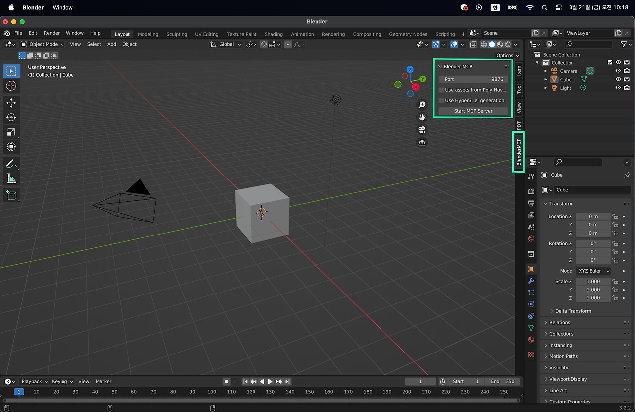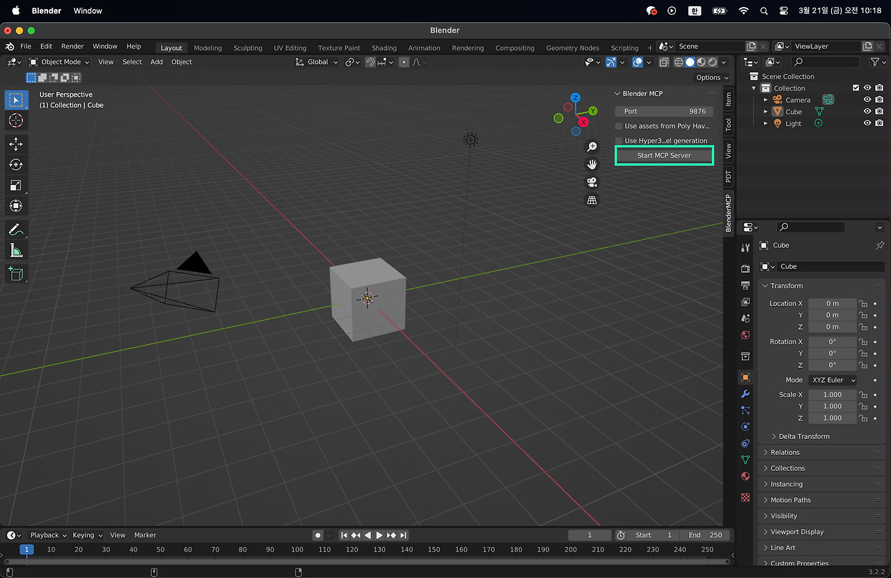 블랜더로 이동하여 BlenderMCP 탭을 통해 보았던 Start MCP Server (혹은 Connect MCP Server) 버튼을 클릭하자. 접속에 성공하면 cancel MCP Server (혹은 Disconnect MCP Server) 버튼으로 변할 것이다.