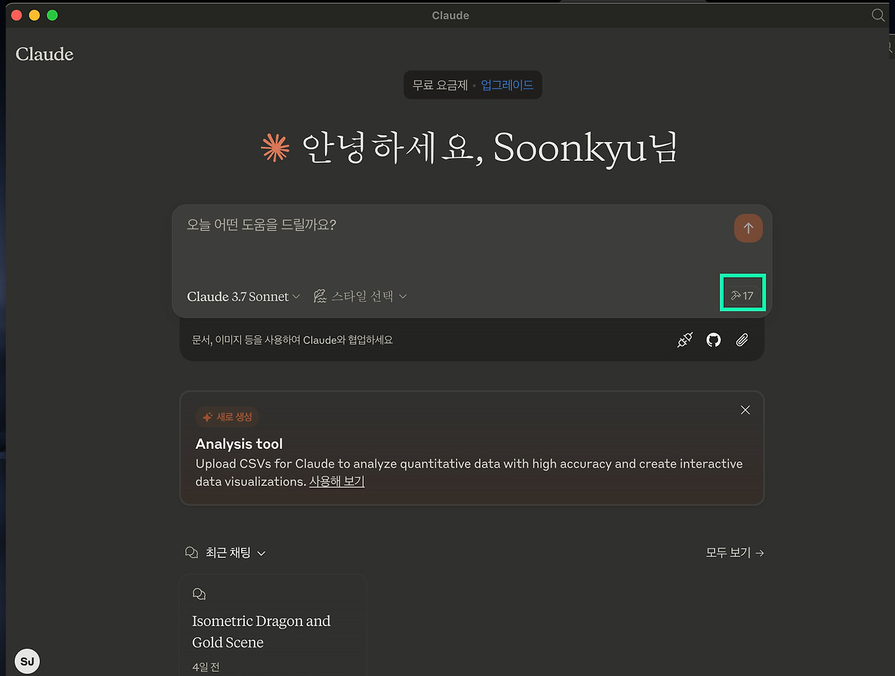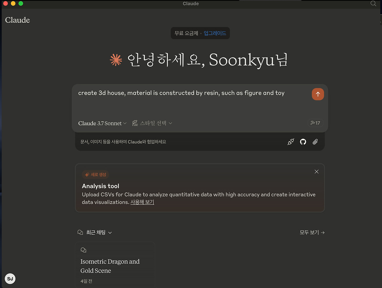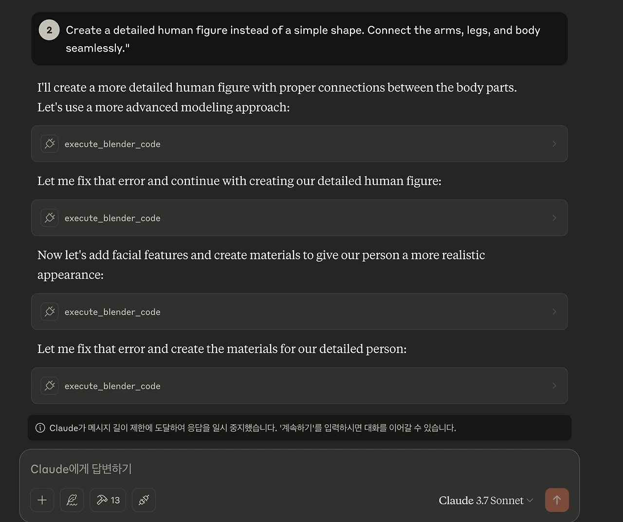 아쉬운 점은 클로드를 유료 버전을 사용하지 않는 이상, 대화를 할 수 있는 한계가 있다는 점이다. 따라서 3D 작업에서 조명, 재질감, 컬러 등 명확하게 모든 작업을 해보고자 한다면 유료 버전을 결재하길 권장한다.