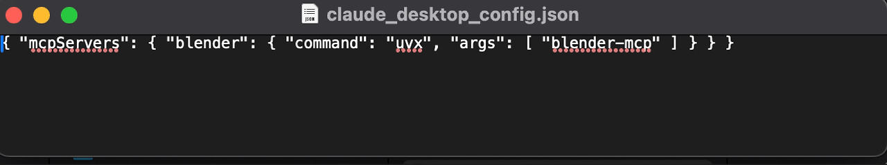 그럼 텍스트 편집기 화면이 활성화되고, [ ] 괄호만 있는 화면이 보일 것이다. 이 [ ] 괄호를 삭제하고, { "mcpServers": { "blender": { "command": "uvx", "args": [ "blender-mcp" ] } } } 코드를 붙여 넣자. 그리고 파일을 저장하고 종료하자.