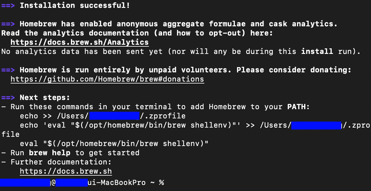 와이파이의 상태에 따라서 몇 분의 시간이 걸릴 것이다. Installing Command Line Tools for Xcode 이 부분에서 꽤 오랜 시간이 걸린다. 설치되는 GUI가 없기 때문에, 그저 시간이 걸리더라도 기다리자. 설치가 완료되었다면, Installation Successful! 메시지와 함께 터미널의 첫 입력창인 'username@usernameui-MacBook ~ %'가 활성화되어 있을 것이다.