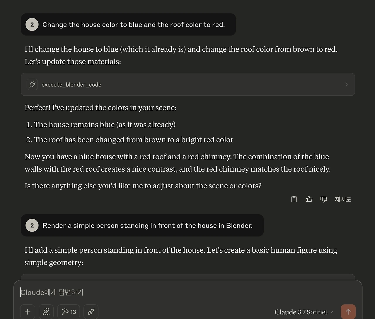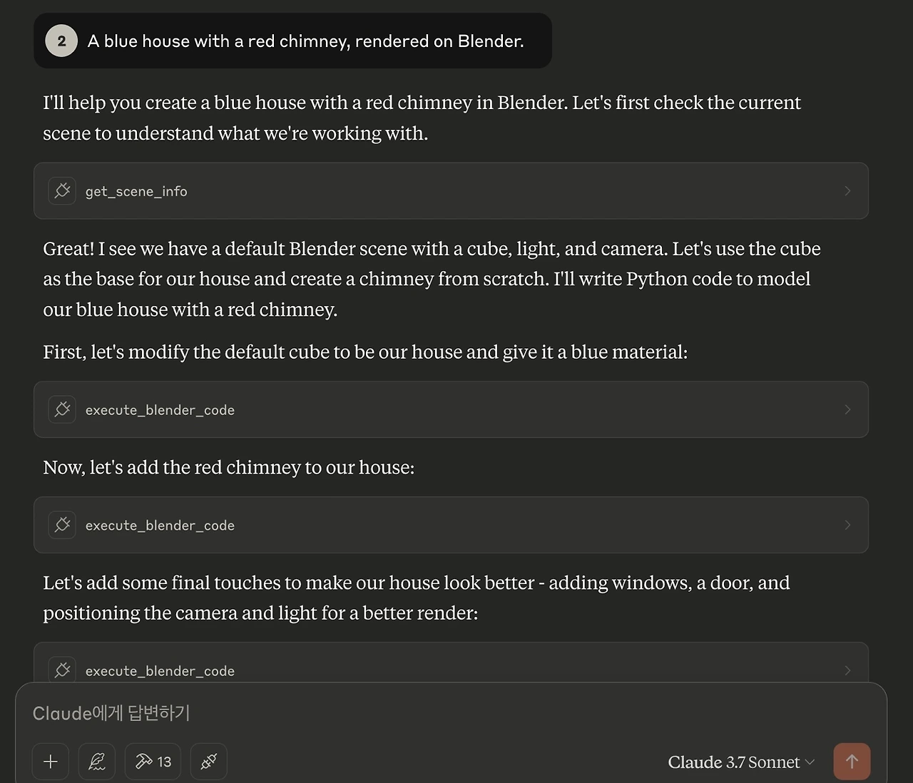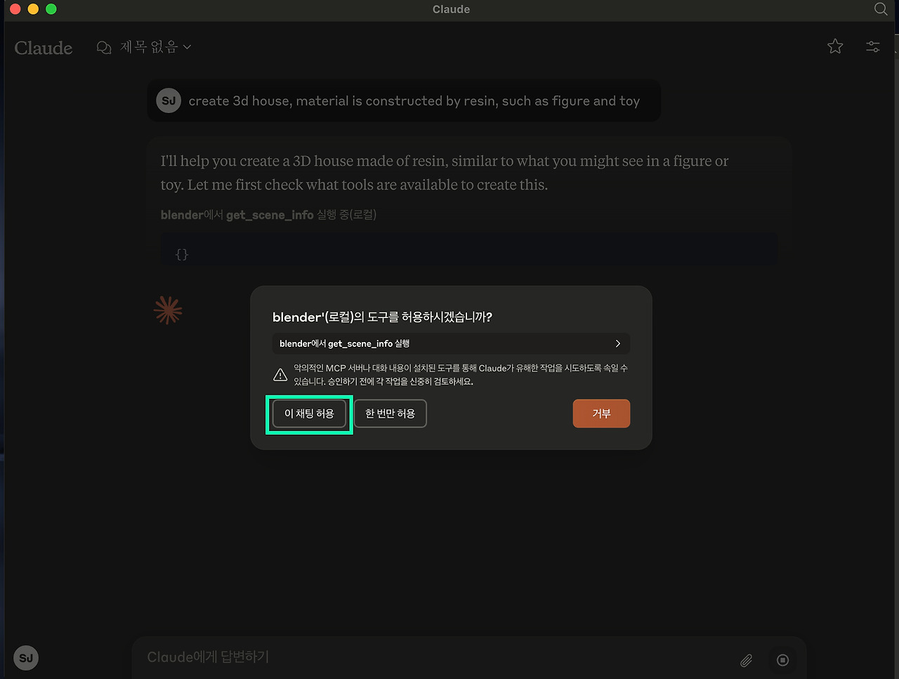 이제 모든 과정이 끝났다. 클로드에 프롬프트를 입력하자. 테스트를 위해서 create 3d house, material is constructed by resin, such as figure and toy 프롬프트를 입력하였다. 그럼 AI가 인식을 하는 모션이 보일 것이다. 곧바로 blender(로컬)의 도구를 허용하시겠습니까 팝업이 활성화될 것이다. 그럼 '이 채팅을 허용' 버튼을 누르자.