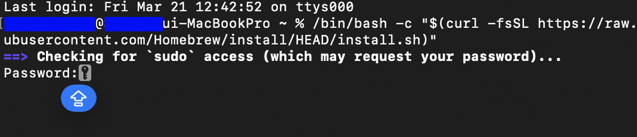 복사가 끝났으면 앞서 3번의 방법처럼 다시 터미널을 열자. 그리고 터미널에 붙여 넣기(command + v)를 하면 코드가 쓰일 것이다. 코드가 넣어졌음 엔터를 클릭하자. 곧바로 비밀번호를 입력하라고 요청할 것이다. 비밀번호는 맥을 켤 때 혹은 앱을 설치할 때 사용하는 컴퓨터 비밀번호다.
