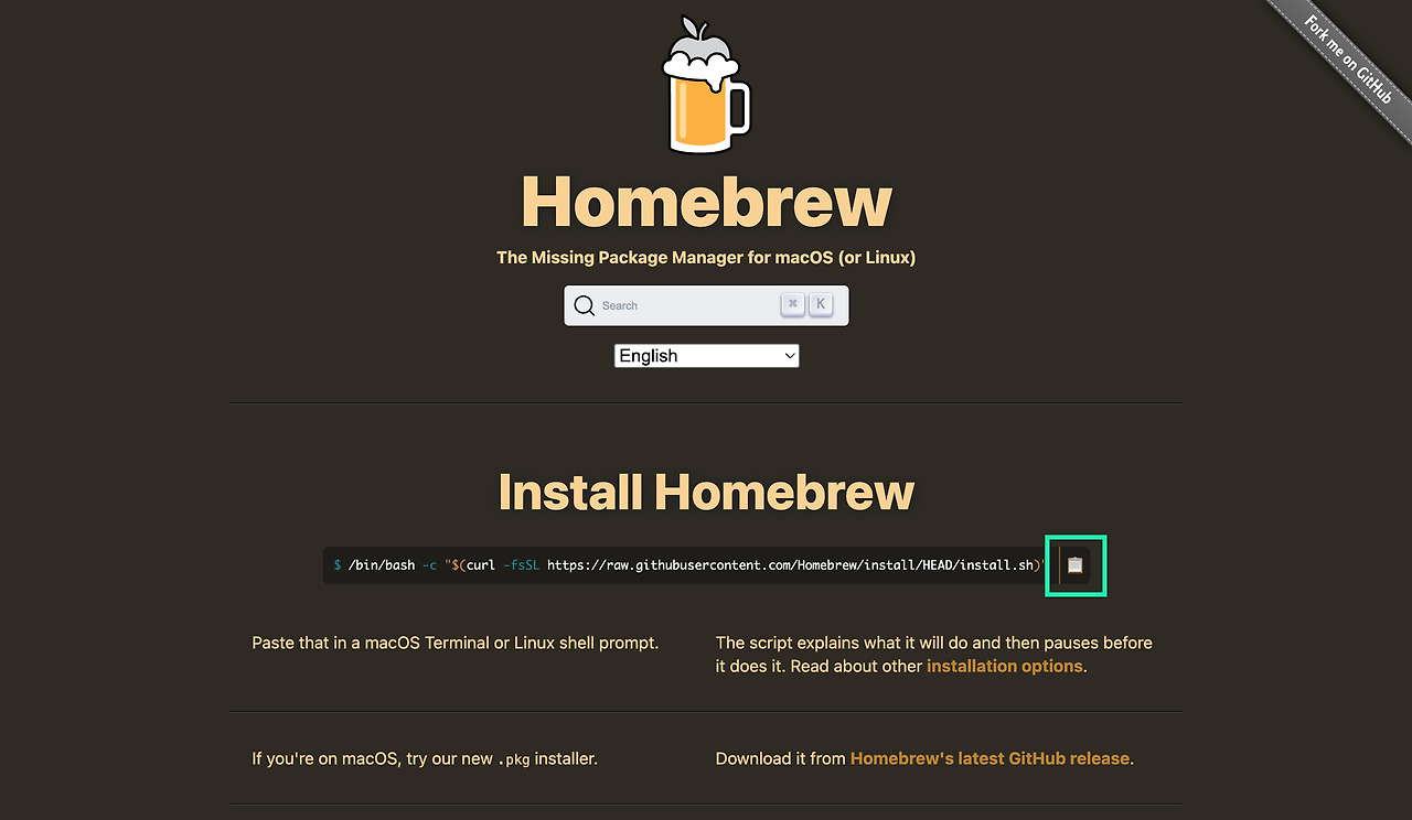 홈 브루는 개발 환경을 보완해 주는 소프트웨어다. 홈브루 설치를 위해 아래 웹사이트를 접속하자. 홈 브루 사이트에서 Install Homebrew 밑에 있는 코드를 복사하자. 복사 방법은 코드 끝 메모 아이콘을 클릭하면 된다.