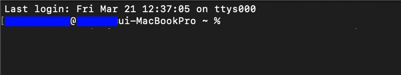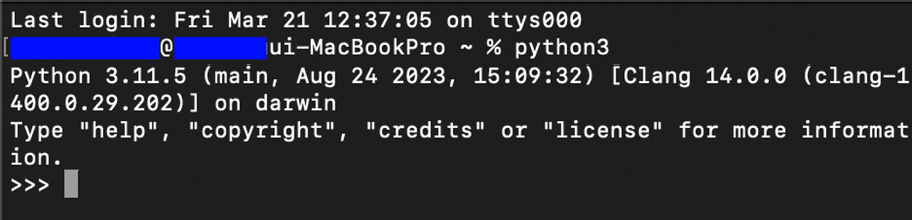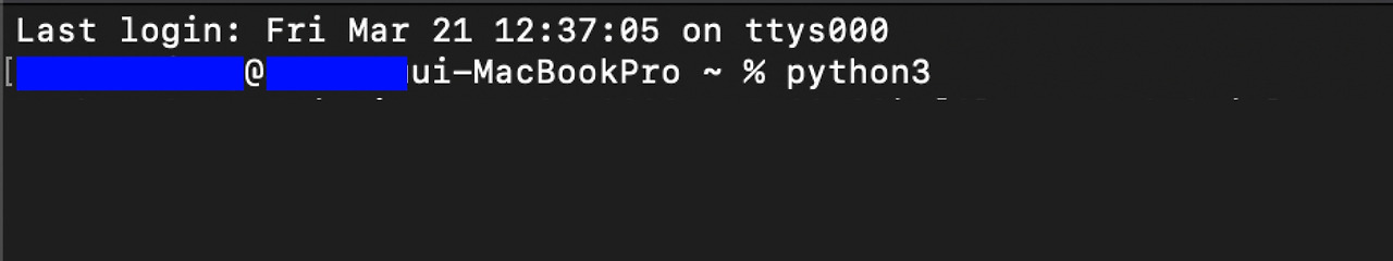 터미널에 접속하면 로그인한 시간 정보와 맥의 사용자 이름 정보 뒤에 명령어를 쓸 수 있도록 되어 있을 것이다. (username@usernameui-MacBook ~ %) 첫 명령어로 파이썬이 잘 설치되었는지 확인하기 위해서 Python3을 프롬프트로 입력해 보자.