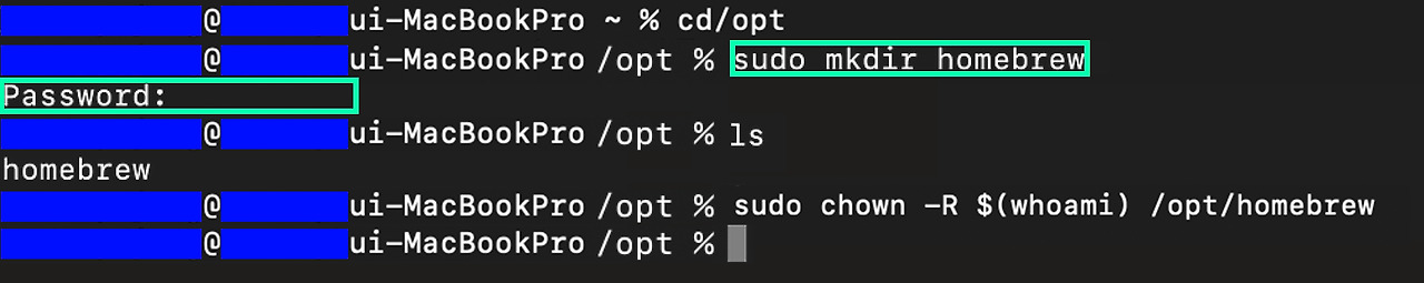 그럼 homebrew 텍스트 밑에 'username@usernameui-MacBook /opt %'가 활성화될 것이다. 그러면 sudo chown -R $(whoami) /opt/homebrew 코드를 입력해서 홈브루의 명령어 권한을 넘겨주자.
