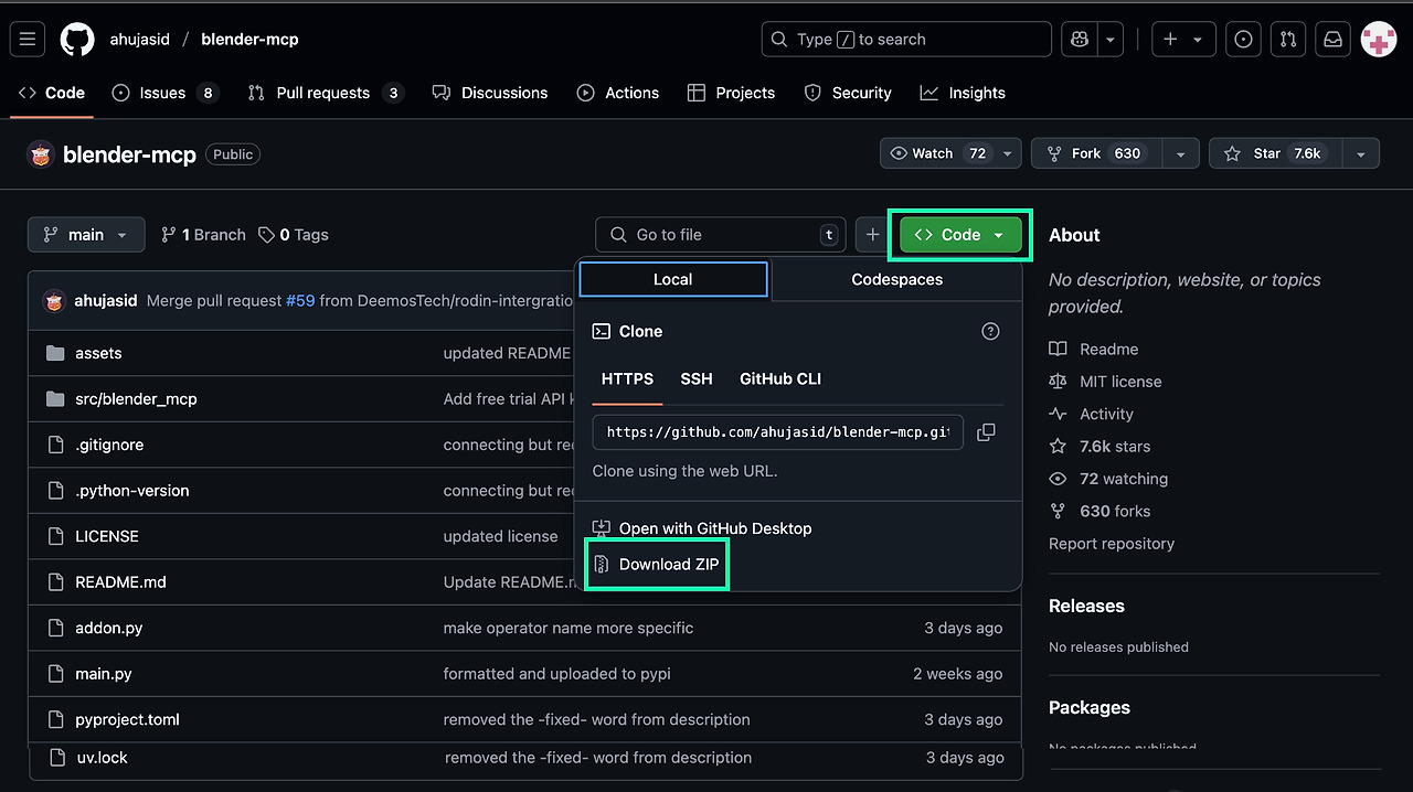 위 사이트는 블랜더의 MCP를 활성화하기 위한 파일이다. 위 사이트에서 파일이 나열된 리스트 위에 <> Code 버튼을 눌러보자. 그럼 팝업이 뜰 것이고, Local 탭에서 Download ZIP 파일을 다운로드하자.