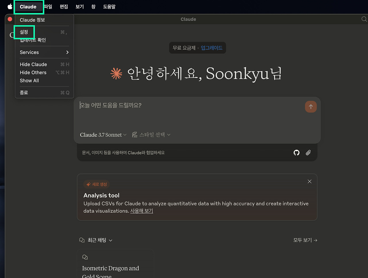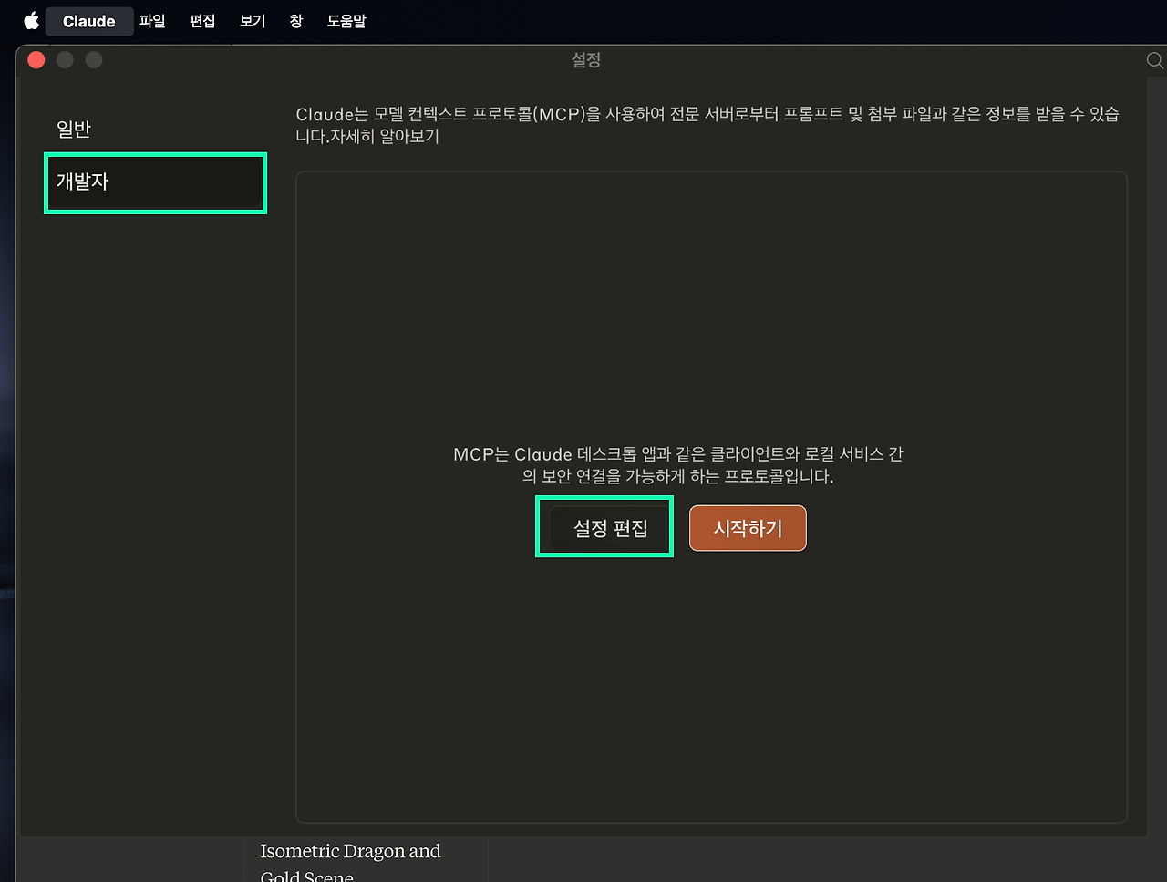 app을 사용하는 중 맥의 상단 탭을 보면, 애플의 사과 마크와 함께 클로드의 기능이 보일 것이다. 여기서 'Cluade - 설정' 으로 이동하자. 그러면 일반/개발자 모드가 보일 것이다. 여기서 '개발자' 모드로 들어가고, '설정 편집' 버튼을 누르자.