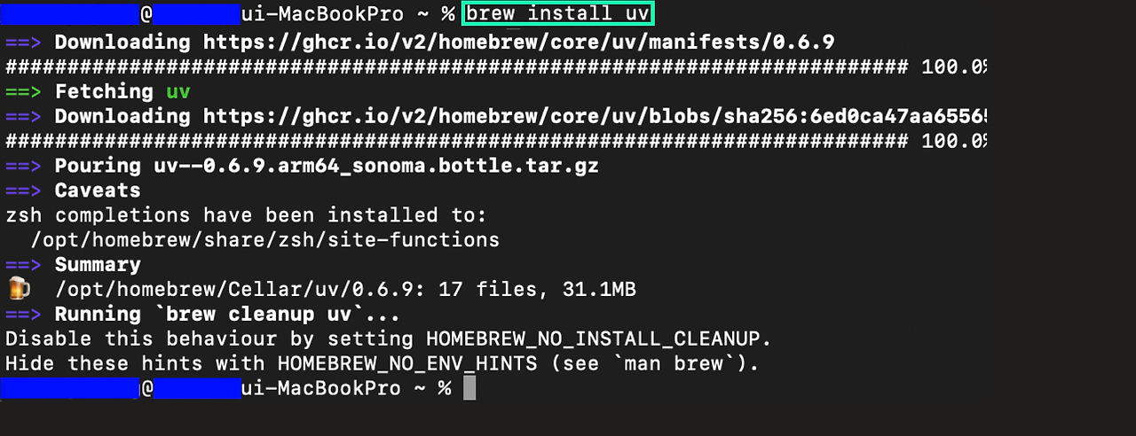 UV는 패키지 설치 및 관리와 패키지 빌드 및 배포까지 가능한 궁극의 파이썬 패키지 및 프로젝트 관리 툴이다. 설치는 매우 간단하다. brew install uv 입력을 하면 끝난다. 위와 마찬가지로 설치가 끝나면 'username@usernameui-MacBook /opt %'가 활성화될 것이다.