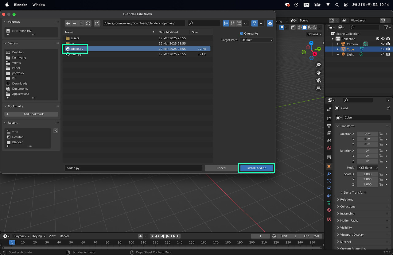 b. Install form disk를 선택하면 보이는 창 중에 가장 익숙한 폴더가 desktop 혹은 downlad일 것이다. 그래서 (6) 단계에서 바탕화면이나 다운로드 폴더에 MCP 파일의 압축을 풀라고 한 것이다. 압축을 푼 환경의 폴더를 클릭하고, Blender-mcp-main 폴더를 찾자.