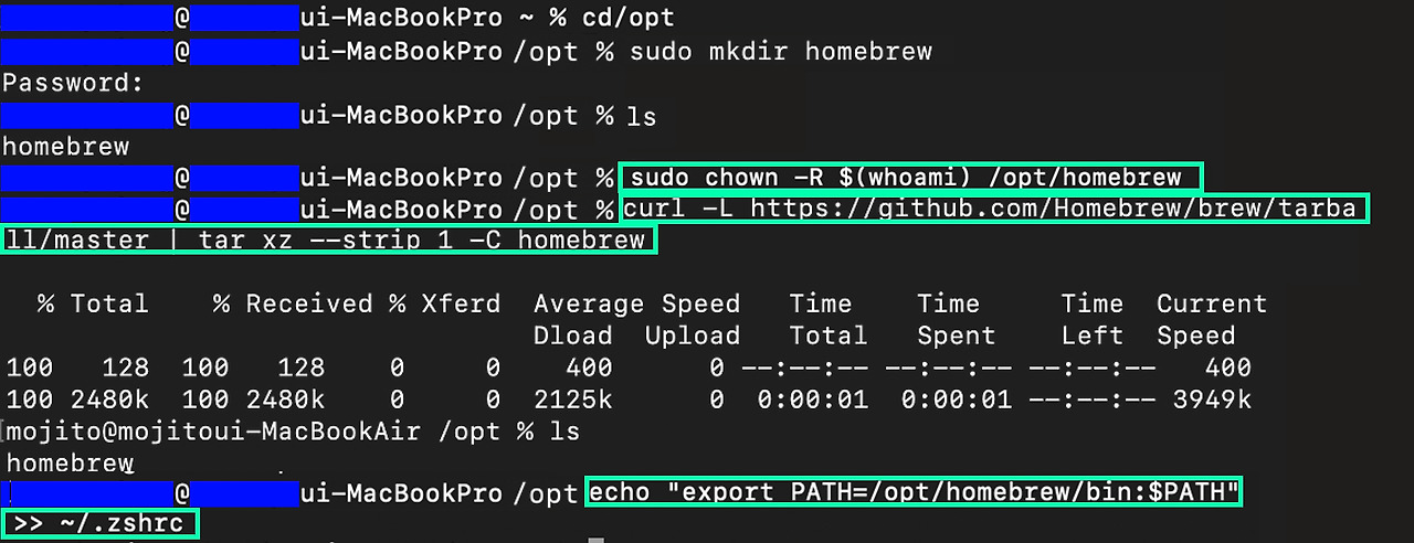 d. curl -L https://github.com/Homebrew/brew/tarball/master | tar xz --strip 1 -C homebrew 코드를 입력해 넣자.