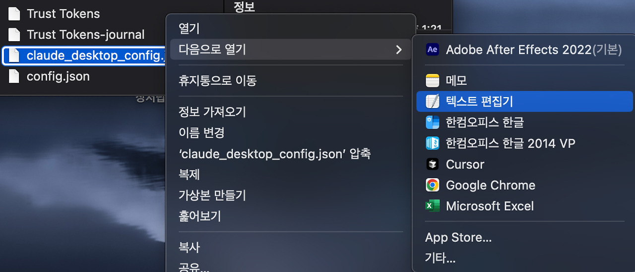 설정 편집 버튼을 누르면, 클로드 폴더와 'claude_desktop_config.json' 파일이 선택되어 있을 것이다. 위 파일을 선택한 상태에서 우측버튼(혹은 손가락 2개)을 눌러 '다음으로 열기 - 텍스트 편집기'를 선택하자.