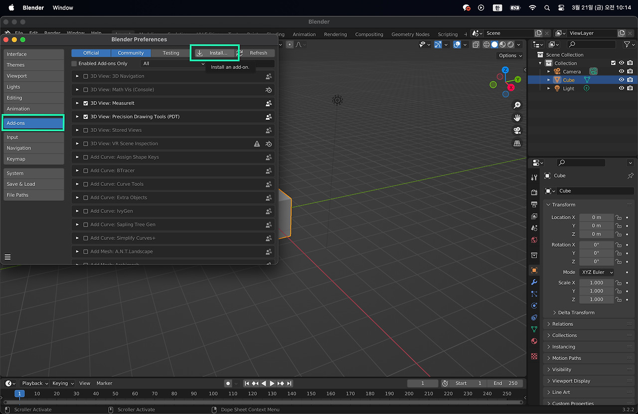 a. 블랜더를 실행하고 상단 탭 'Edit - Preferences' 접속을 하자. 다음 팝업창에서 'Add-on'에 접속하자. 다음으로, 'Install from disk'를 클릭하자.