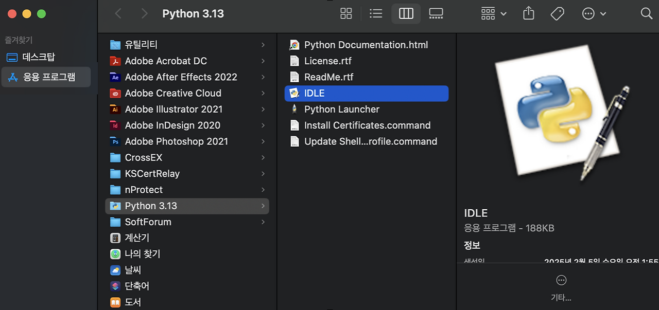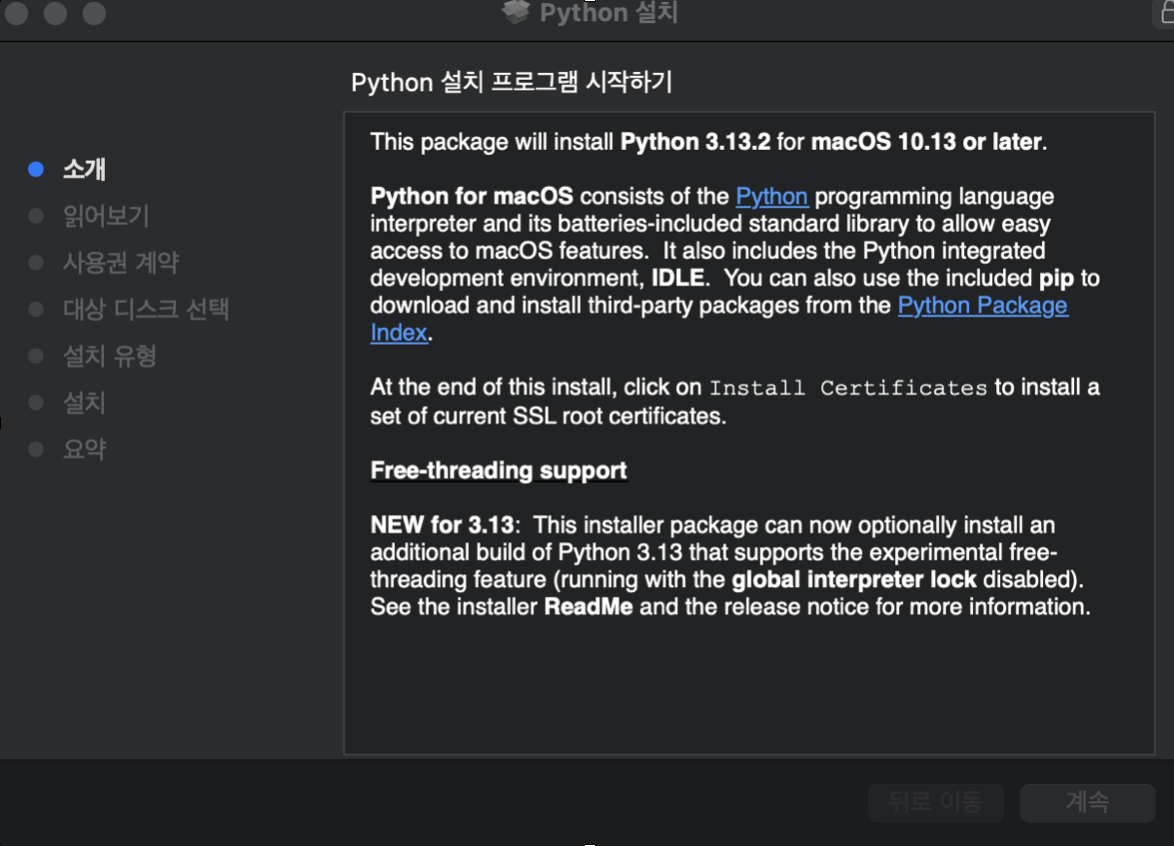 다운로드한 파일을 설치하면 하단 우측 '계속' 버튼을 클릭, 클릭하면 쉽게 설치할 것이다. 설치가 끝나면 응용 프로그램에서 파이썬 파일을 찾아볼 수 있다.