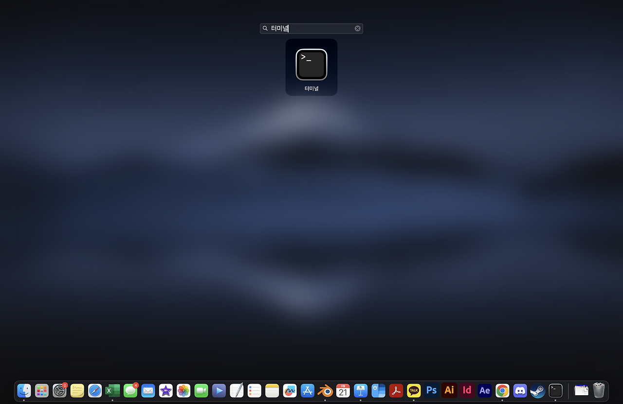 이제 맥의 터미널을 실행해야 한다. 터미널은 통신 및 터미널 에뮬레이션 응용 프로그램 소프트웨어 프로그램이다. 맥의 홈 화면에서 손가락 4~5개를 트릭패드에 올리고 오므려보자. 그럼 런치패드 화면이 등장할 것이다. 여기서 터미널을 검색하면 쉽게 접속할 수 있다.