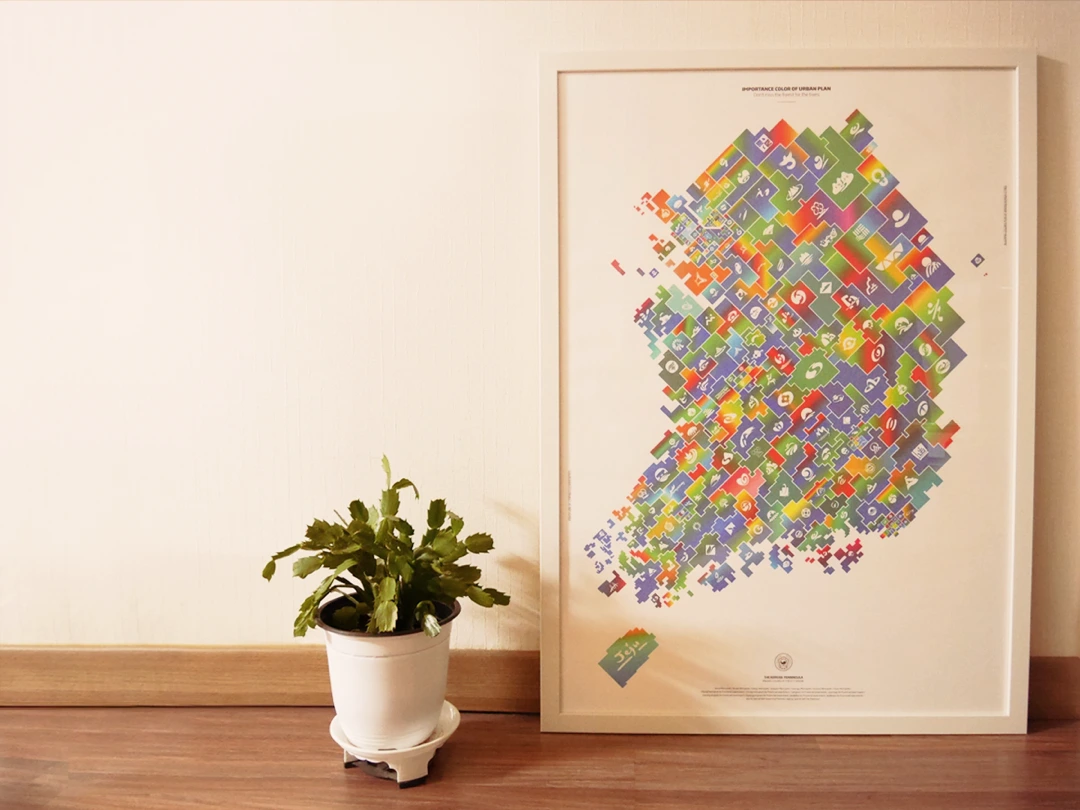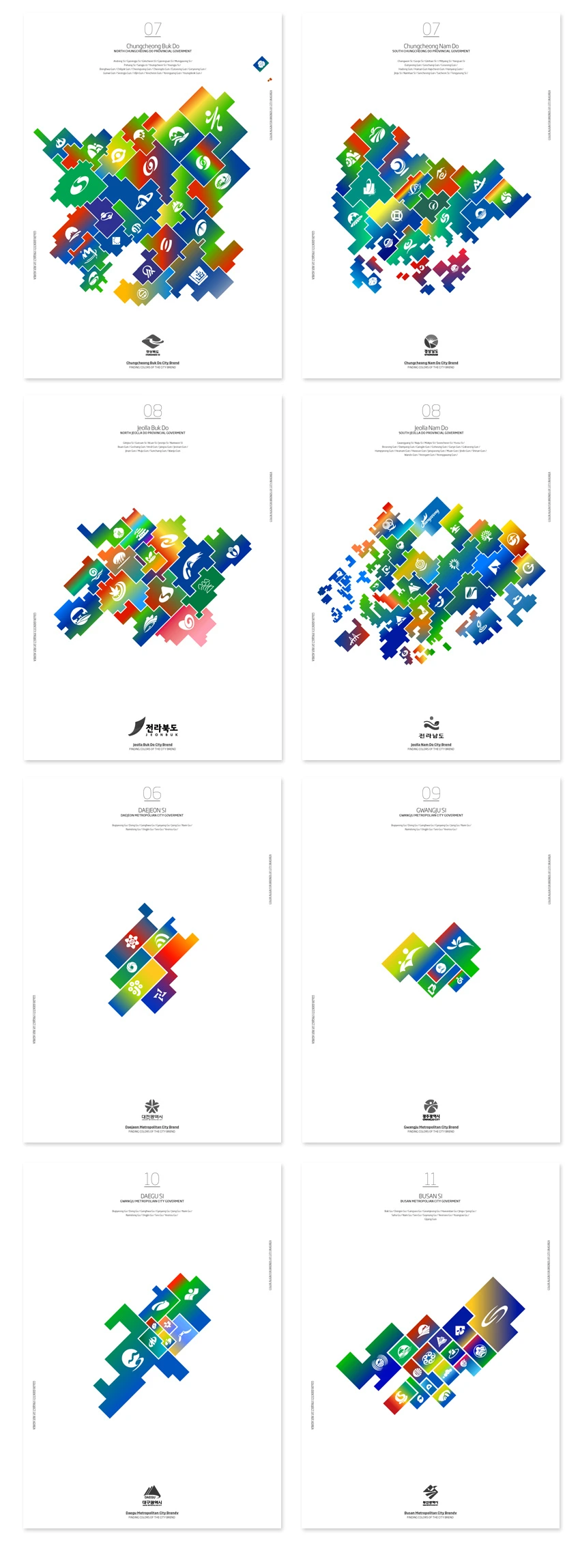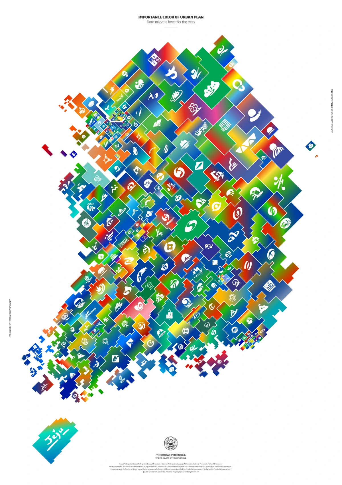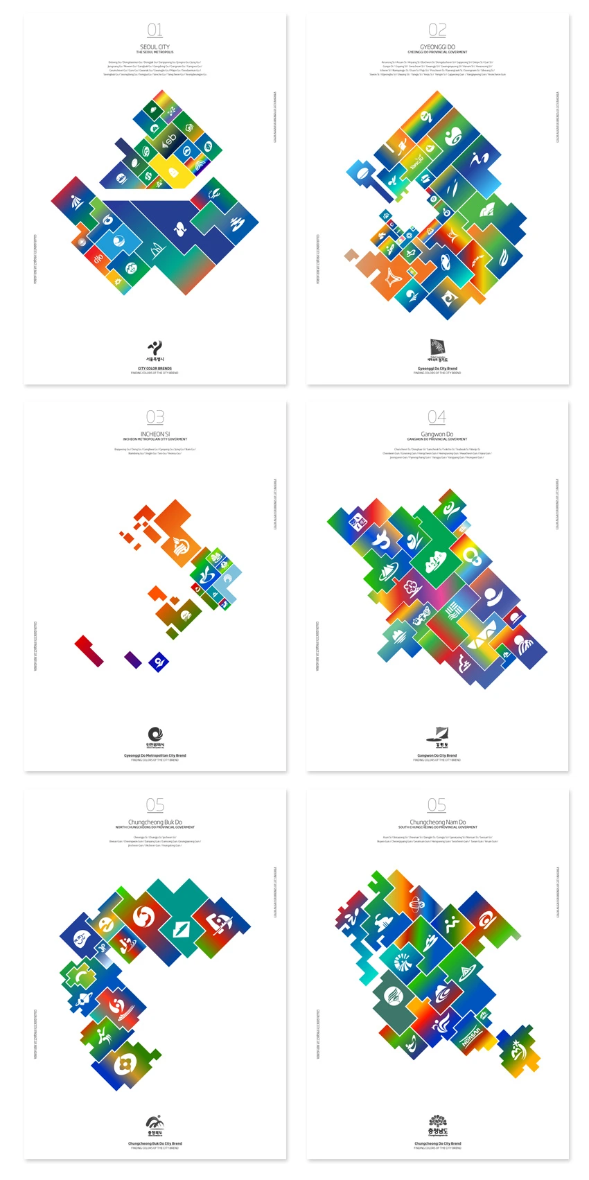 따라서 우리나라의 각 지역의 통합되지 않은 아이덴티티의 상황을 전달하기 위해서 각 지역을 구분 짓는 맵을 만들고 지역 별 심벌마크를 배치하여 인포 그래피를 제작하였다. 각 지역의 통합되지 않은 중구난방의 컬러의 상황을 전달하기 위해서 지역에서 사용하는 컬러의 사용 빈도를 중심으로 그라디언트(Gradient)로 나열하였다.