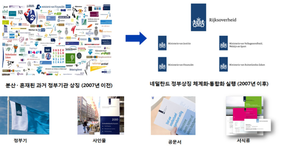 현재 많은 국가와 정부에서는 다양하게 사용되는 아이덴티티를 통합하는 사례가 늘어나고 있다. [그림 10]와 같이 네덜란드는 각 정부 부처마다 혼잡하게 심볼을 사용하고 있었다. 하지만 2007년 이후 네덜란드 정부는 네덜란드 왕실의 문양을 중심으로 각 정부 부처의 심볼을 하나로 통합을 하는 디자인 프로젝트를 진행했었다.