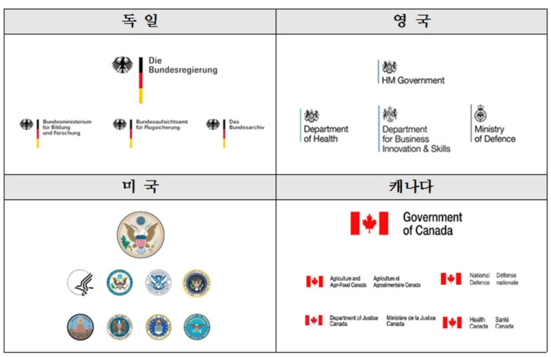 또한 [그림 11]에서는 네덜란드와 비슷하게 통합된 심볼로 정부 부처의 마크를 통합한 독일과 캐나다의 사례가 있었고, 영국은 다양한 정부 부처의 심볼을 하나의 범주로 느낄 수 있도록 컬러와 라인을 동일하게 활용하는 사례가 있었다. 또한 미국은 정부 부처의 마크를 동일한 사이즈의 원형에 응용하는 방향으로서 통합방향으로 응용되고 있다.