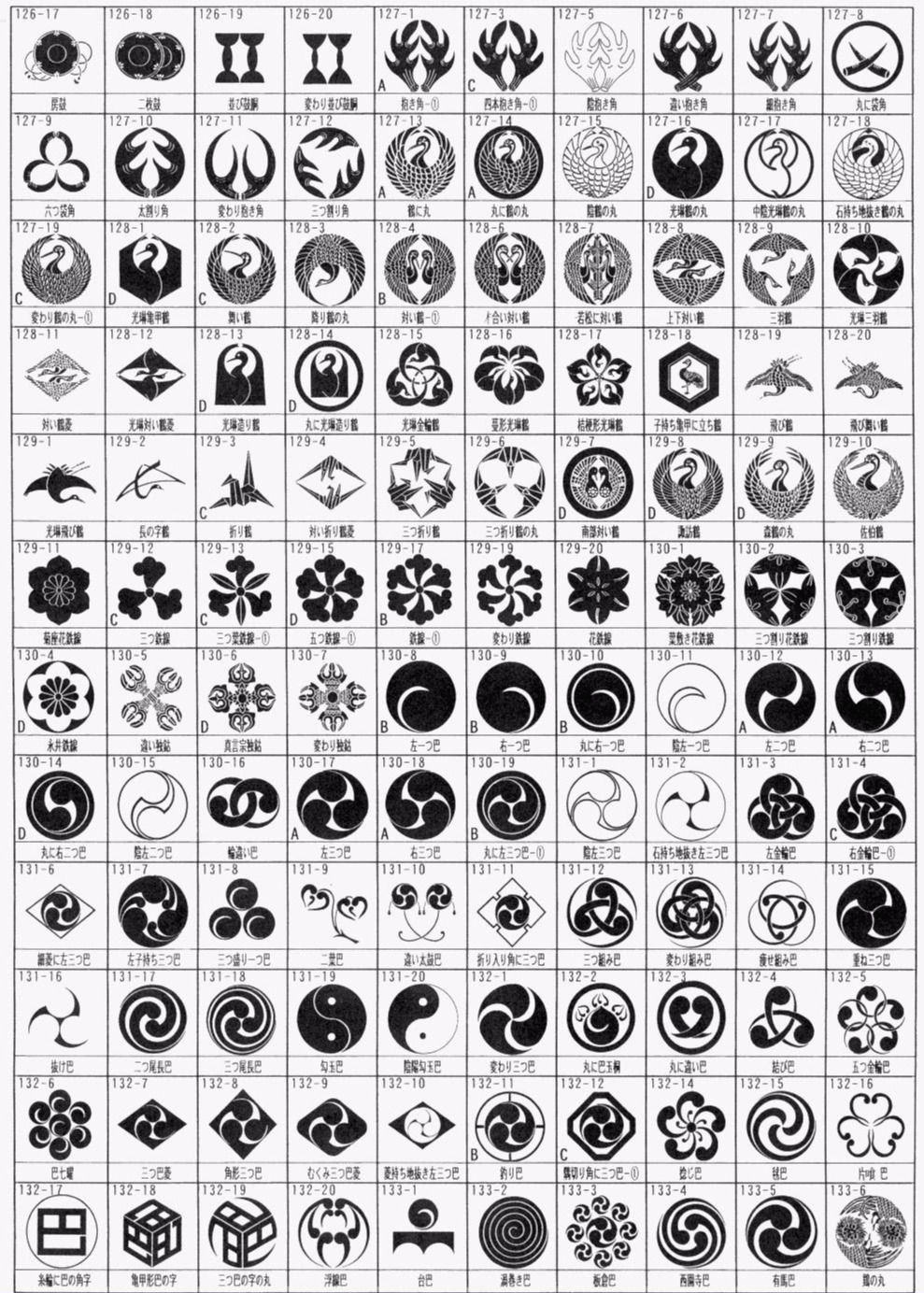 [그림 02]는 일본의 중세시대부터 만들어진 지배계층 및 사무라이 가문의 문양입니다. 이는 12세기 봉건 사회인 일본에서는 각 가문의 정체성을 표현하기 위한 문장을 ‘가몬(家門, かもん)’이라고 불렸다. 가몬은 서양의 문장과 다르게 원 안에 독특한 상징을 담았고, 군사적인 상징이나 동물의 상징 또는 식물을 상징하는 문양을 그려 넣었고, 주로 장남들은 가몬을 이어받고 다른 형제들은 기본 형태를 조금 변형한 가문을 사용하였다.