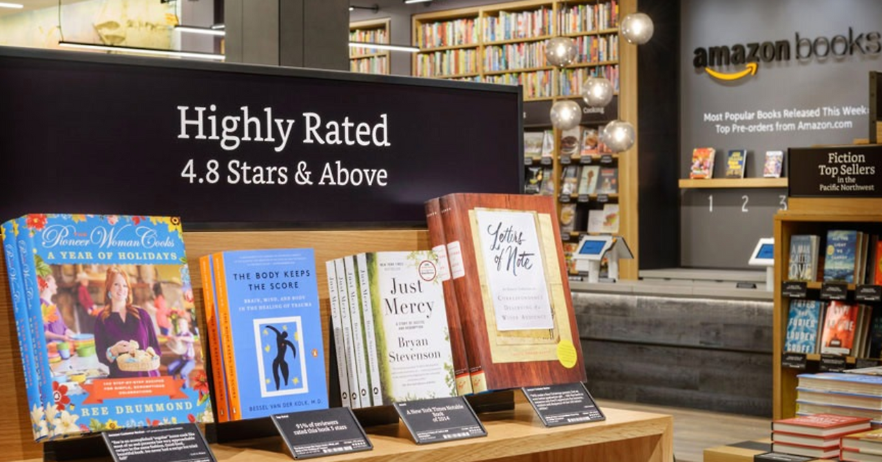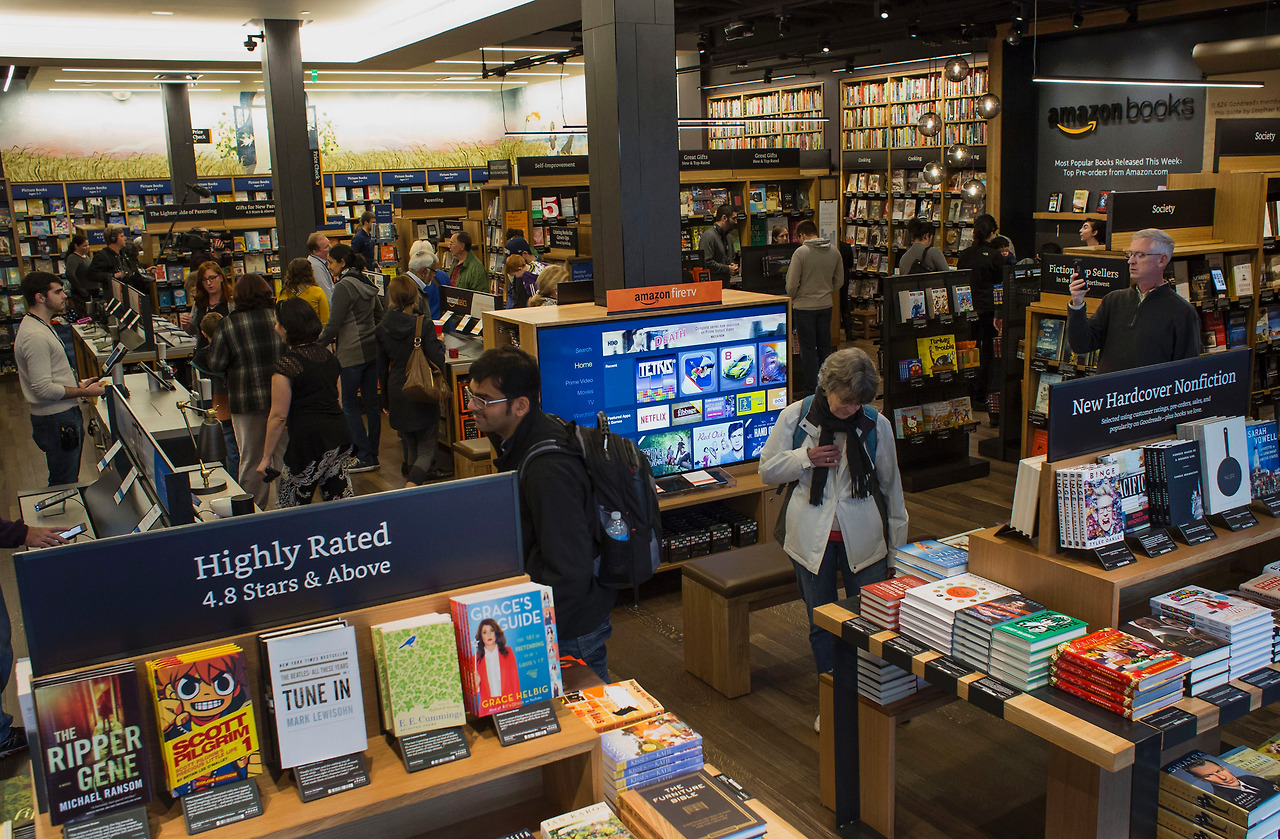 아마존은 고객을 서점으로 불러 모으게 위해 온라인에서 축적된 경험을 오프라인에도 적용하고 있다. 인터넷에서 책의 썸네일만 보이는 방식을 서점의 진열 방식으로 활용하고 있다. 온라인 고객의 평점을 중심으로 책을 진열하는 방식과 함께, 온라인에서 쉽게 볼 수 있는 관련 추천 서적의 기능도 적용되고 있다.