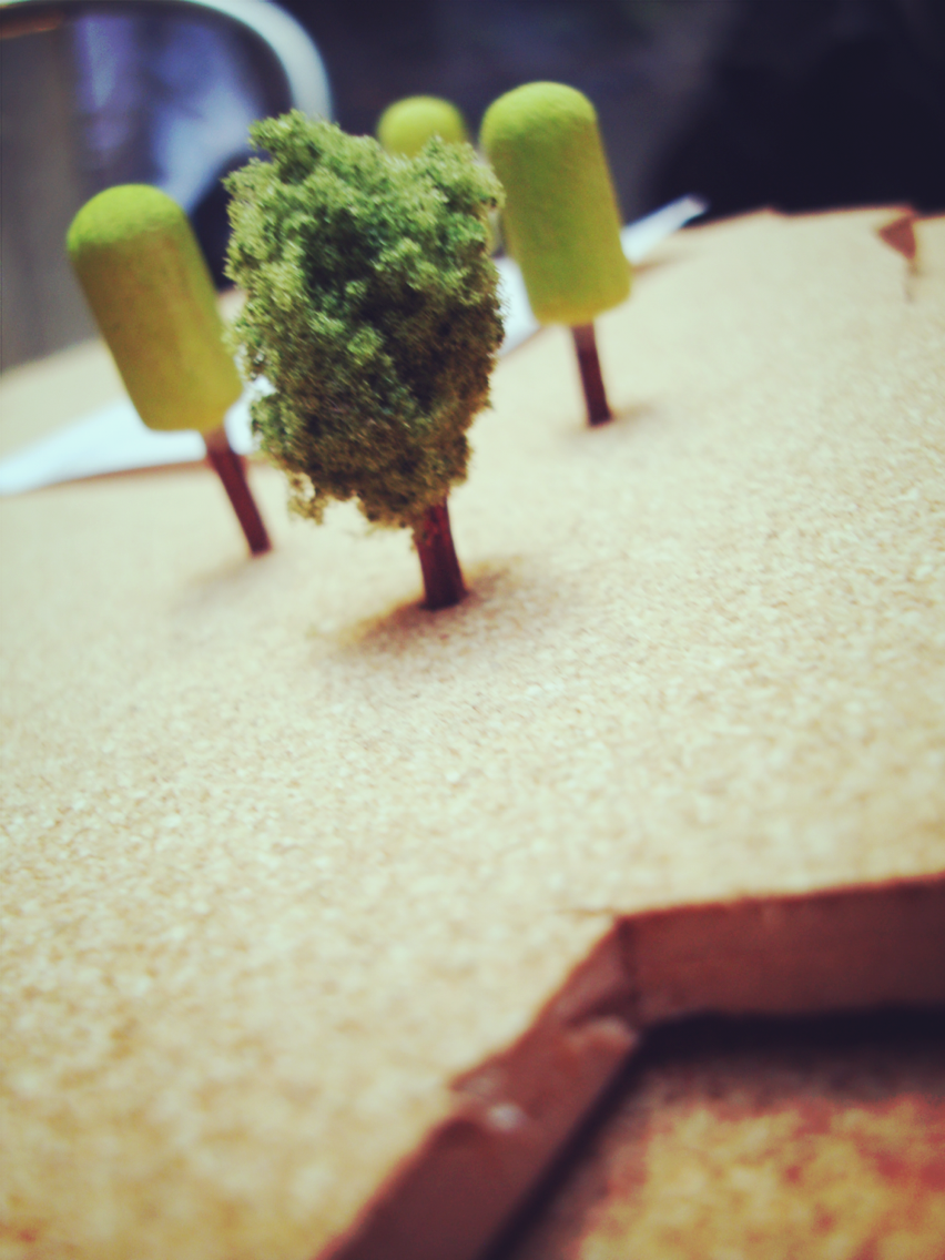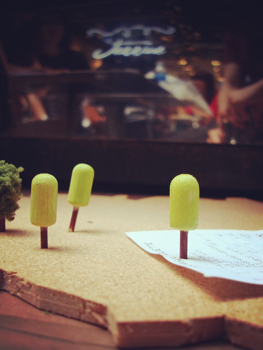 코르크 보드는 마치 사막처럼 보이는 재미가 있습니다. 사막 위에 나무를 꽂는다는 행위처럼 보이게 만들었습니다. 이러한 접근을 이렇게 정리했습니다.