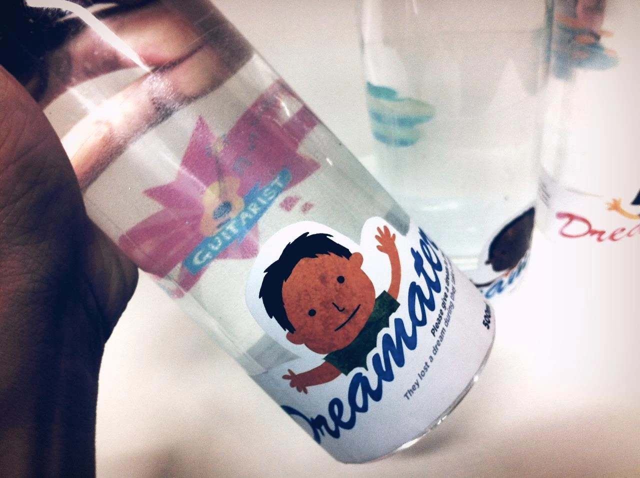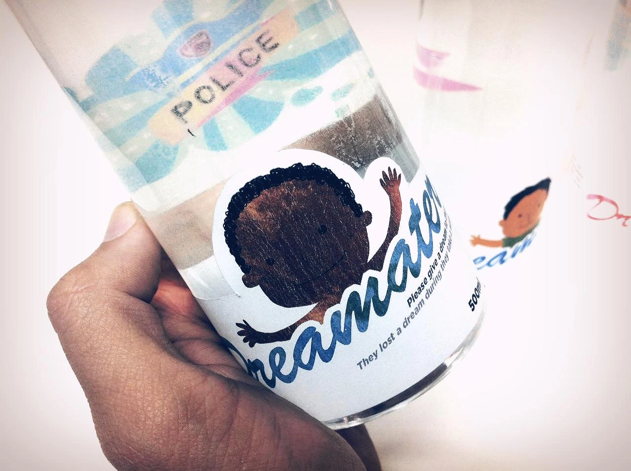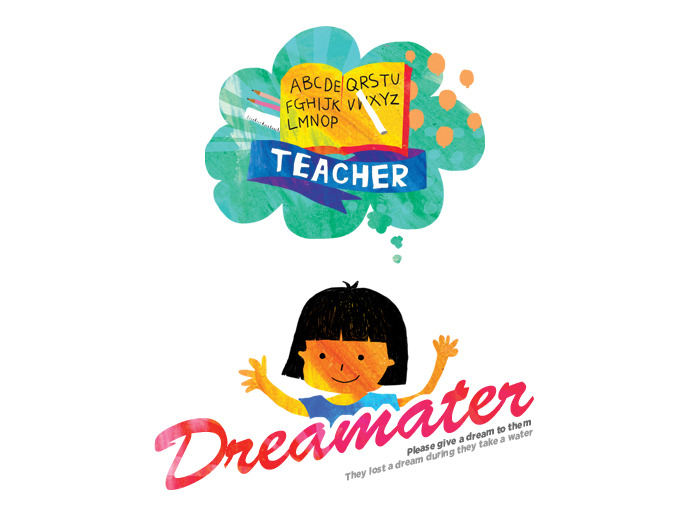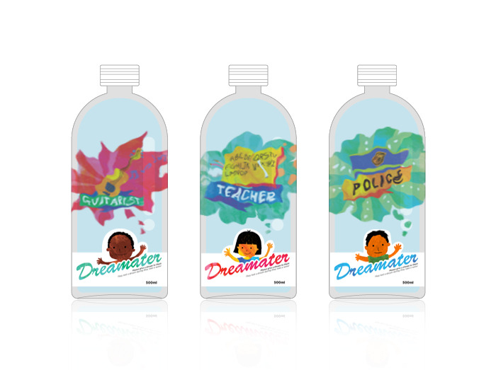 이 프로젝트는 꿈(Dream)과 물(Water)을 조합한 'Dreamater'로 명명했습니다. 타이틀과 어린이 일러스트는 생수병 앞에, 꿈을 그린 일러스트는 생수병 뒤에 배치시켰습니다. 이는 굴절 효과를 활용하기 위해서입니다. 여러분들도 알다시피 물병 뒤에 보이는 배경은 우리 눈으로 보는 것보다 조금 더 크게 보이는 효과입니다.