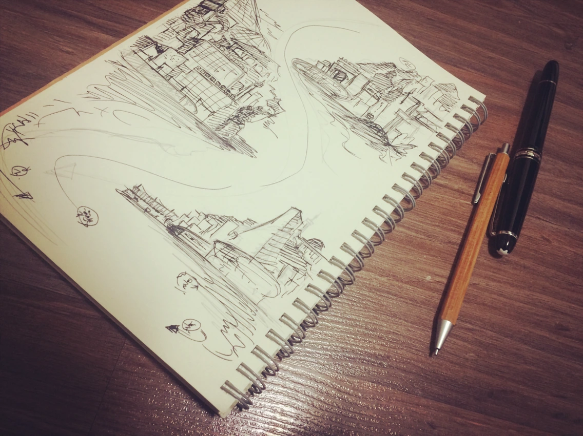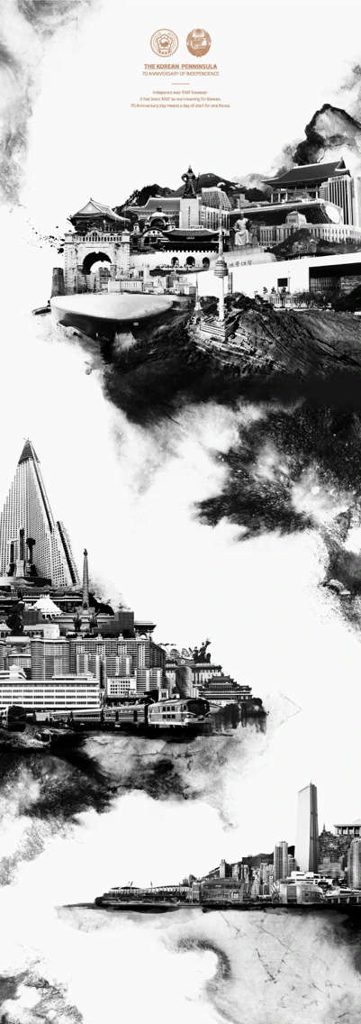 이러한 생각을 담기 위해서, 서울과 평양의 대표적인 건축물들을 모아보기 시작했다. 양쪽에 이질적인 건물들을 통해 경각심을 심어주고 싶었다. 가운데는 태극 문양처럼 보이는 여백을 배치시켰다. 이는 태극기가 조선시대 말기 우리 민족을 대표하는 국기로서 사용되었기 때문이다.